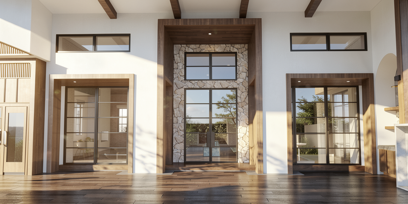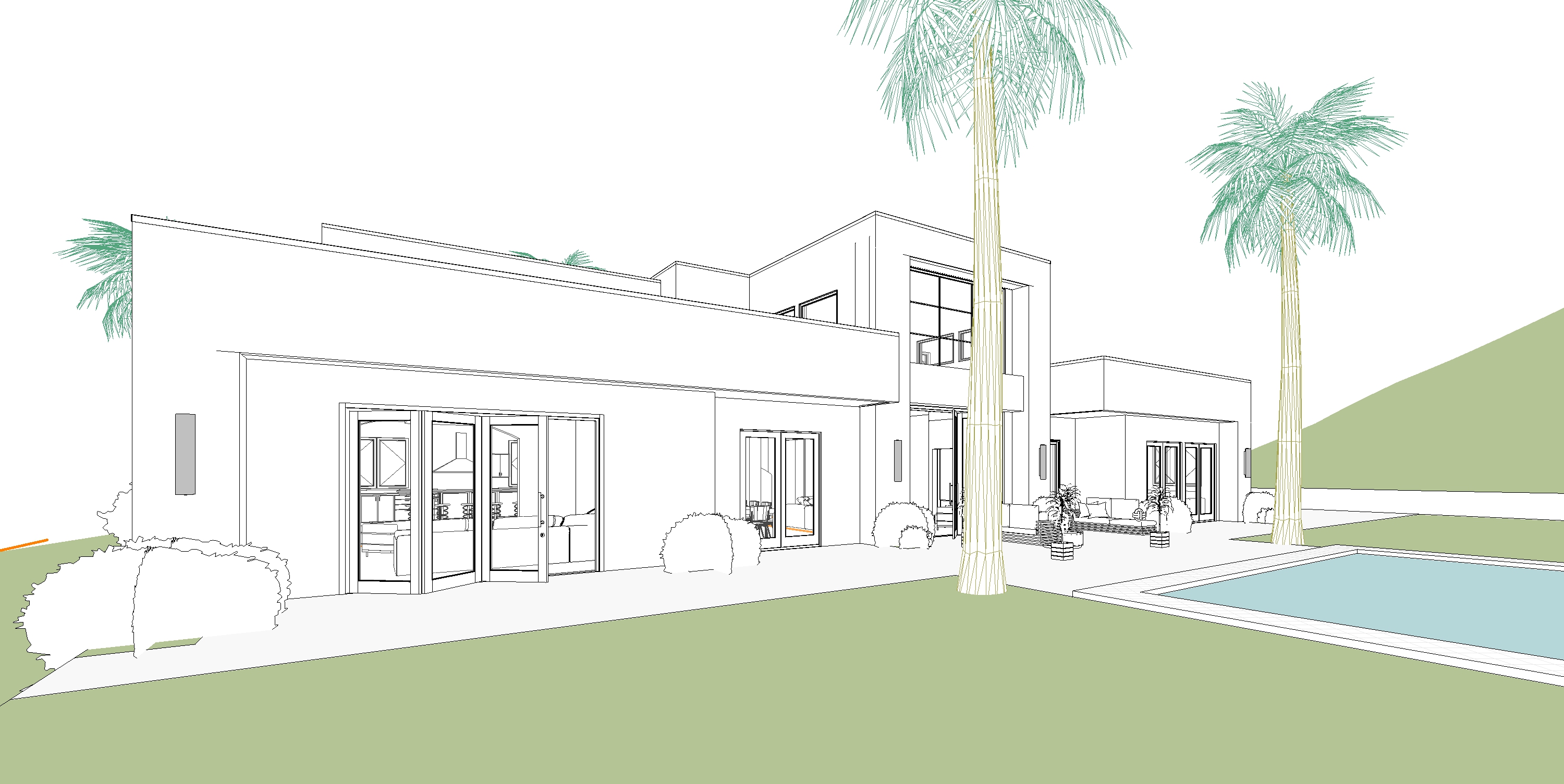 make the building white black window and door frames add under soffit recessed lights night shot
