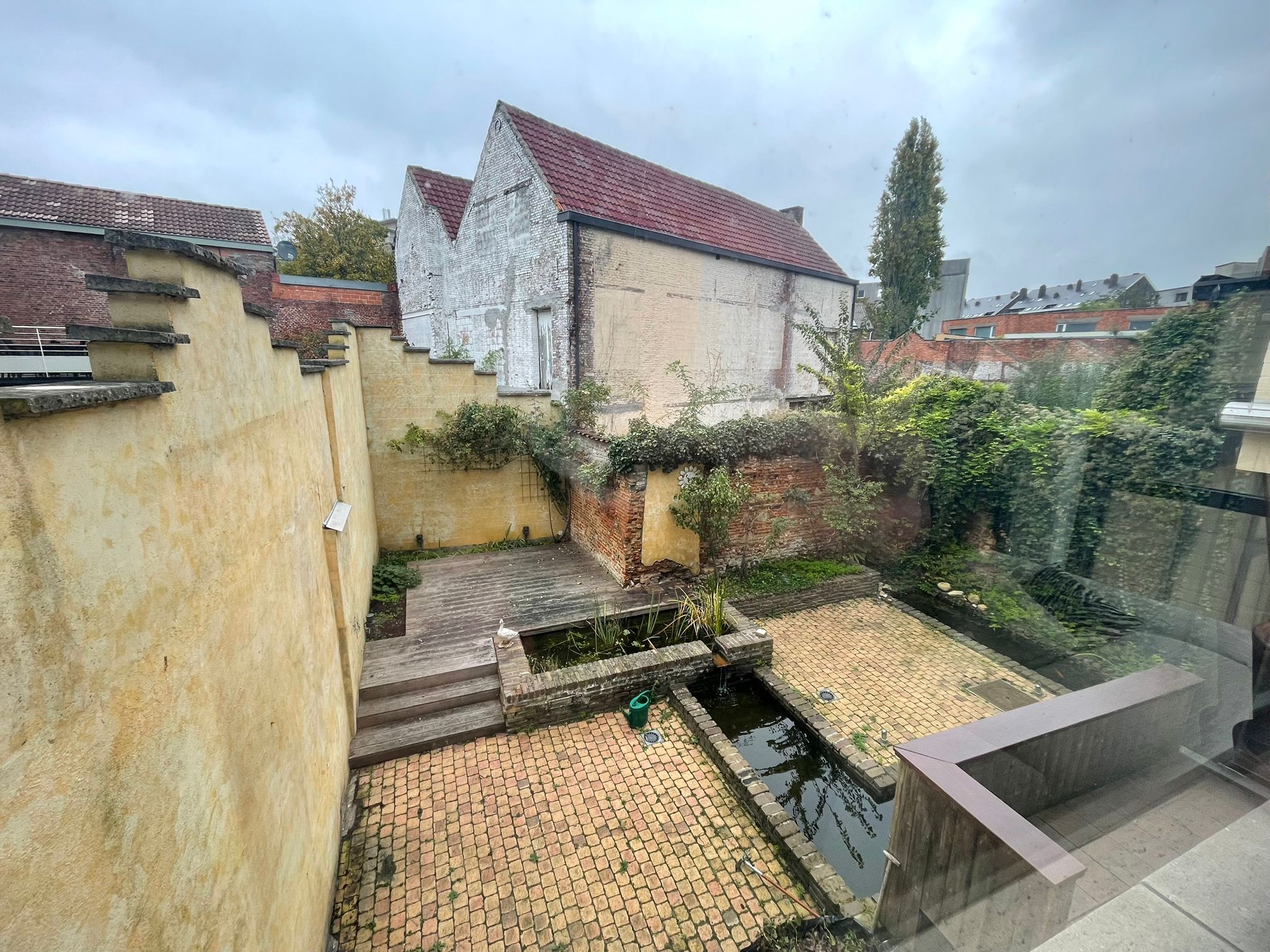 mordern concrete paving small koi pond greenery concrete built in benches fire pit pizza oven