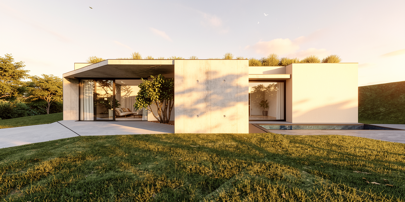 erstelle f r exakt dieses haus eine realistische au enansicht das haus soll in einem dezent modernen garten situiert sein und eine breite zufahrt von rechts zum carport aufweisen behalte alle ma e und farben des hauses exakt bei