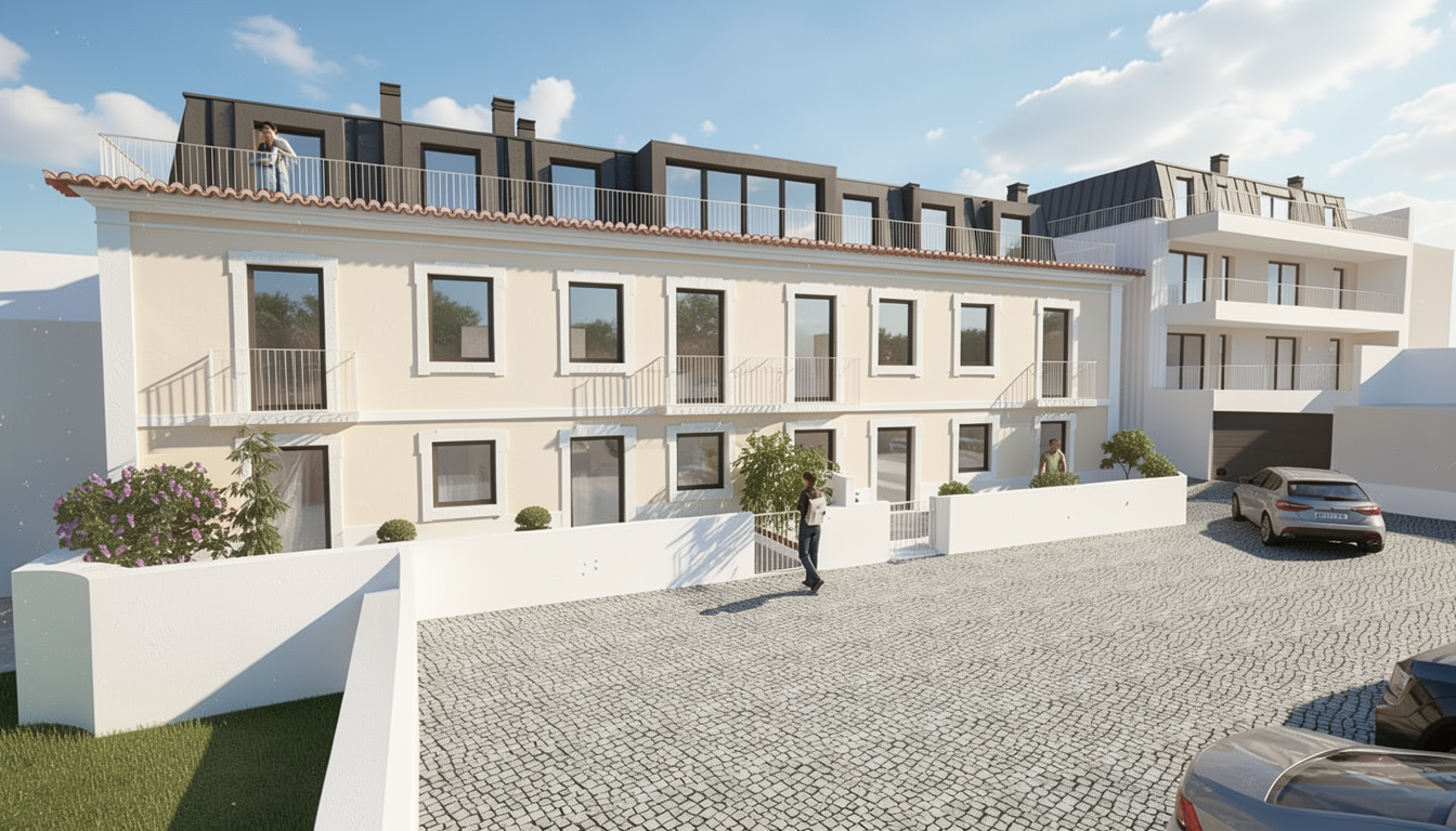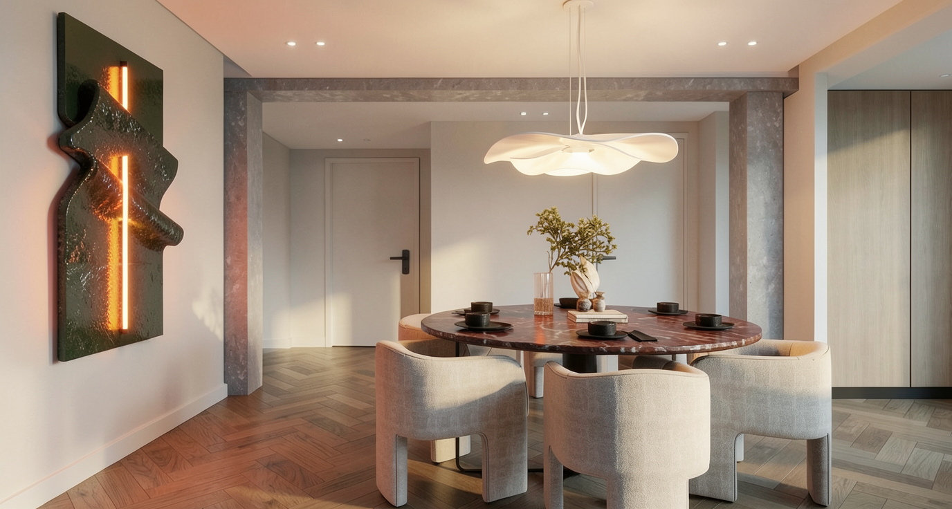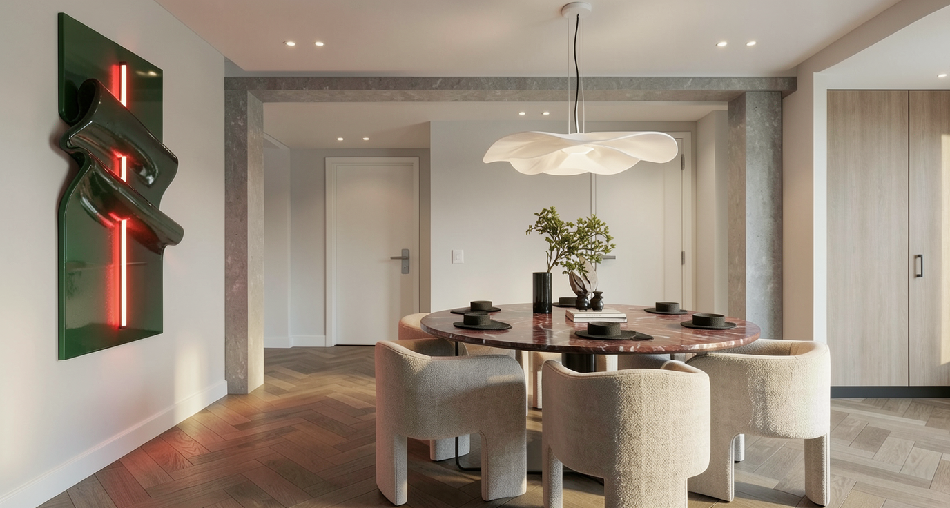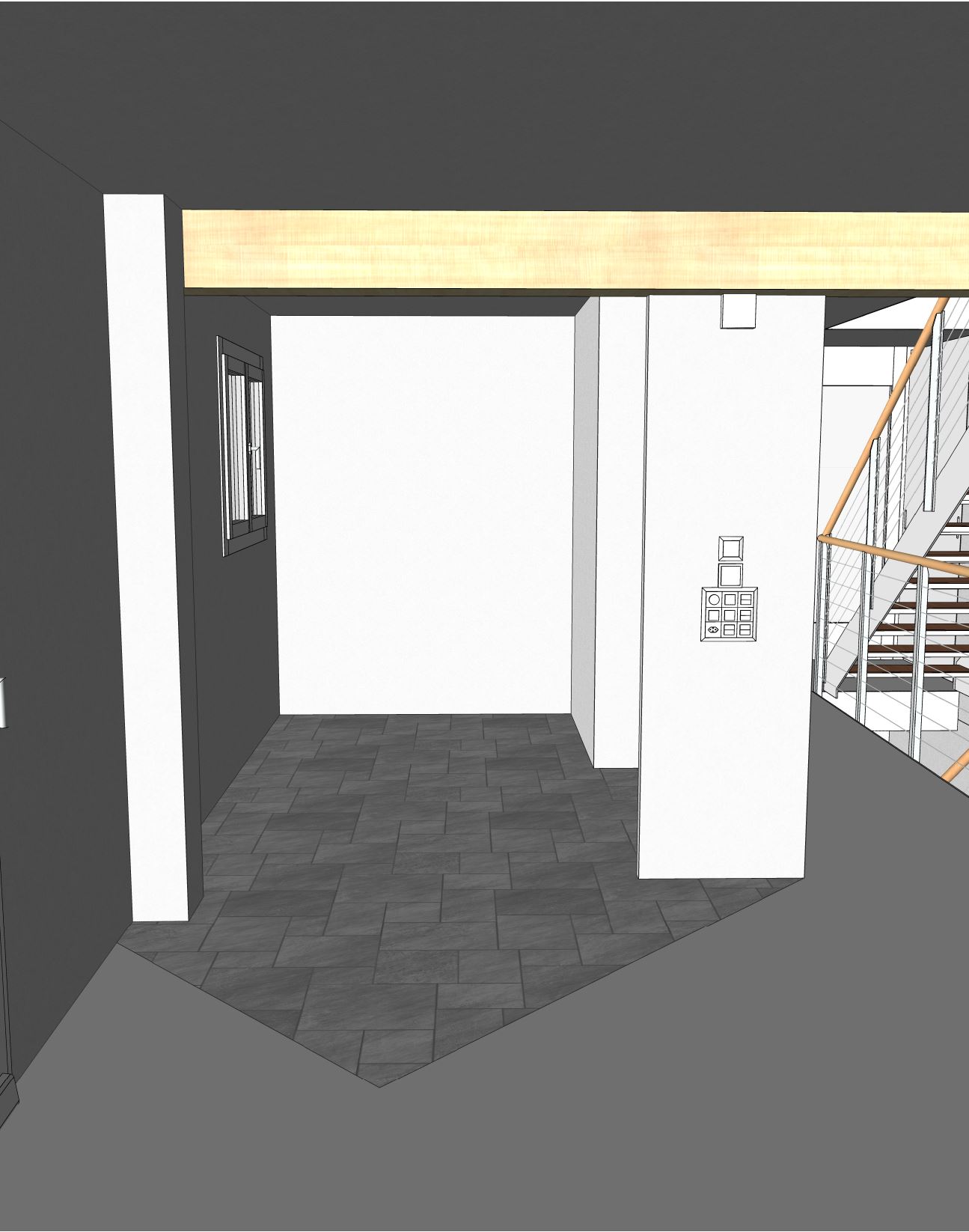 interior shot transform this space into a modern swiss kitchen integrated into the existing architecture the space must clearly function as a real usable kitchen insert built in kitchen cabinetry within the recessed wall niche use the right side niche for full height tall cabinets with integrated appliances add a functional kitchen work area with countertops and storage the layout can adapt naturally to the room geometry a kitchen island or angled peninsula is allowed if spatially appropriate respect circulation and openness matte handleless cabinetry in warm neutral white minimal swiss detailing precise carpentry dark natural stone countertops fine grained and matte keep staircase walls ceiling beam and floor unchanged do not modify architecture bright natural daylight calm swiss interior atmosphere minimal refined high end bespoke carpentry photorealistic architectural visualization