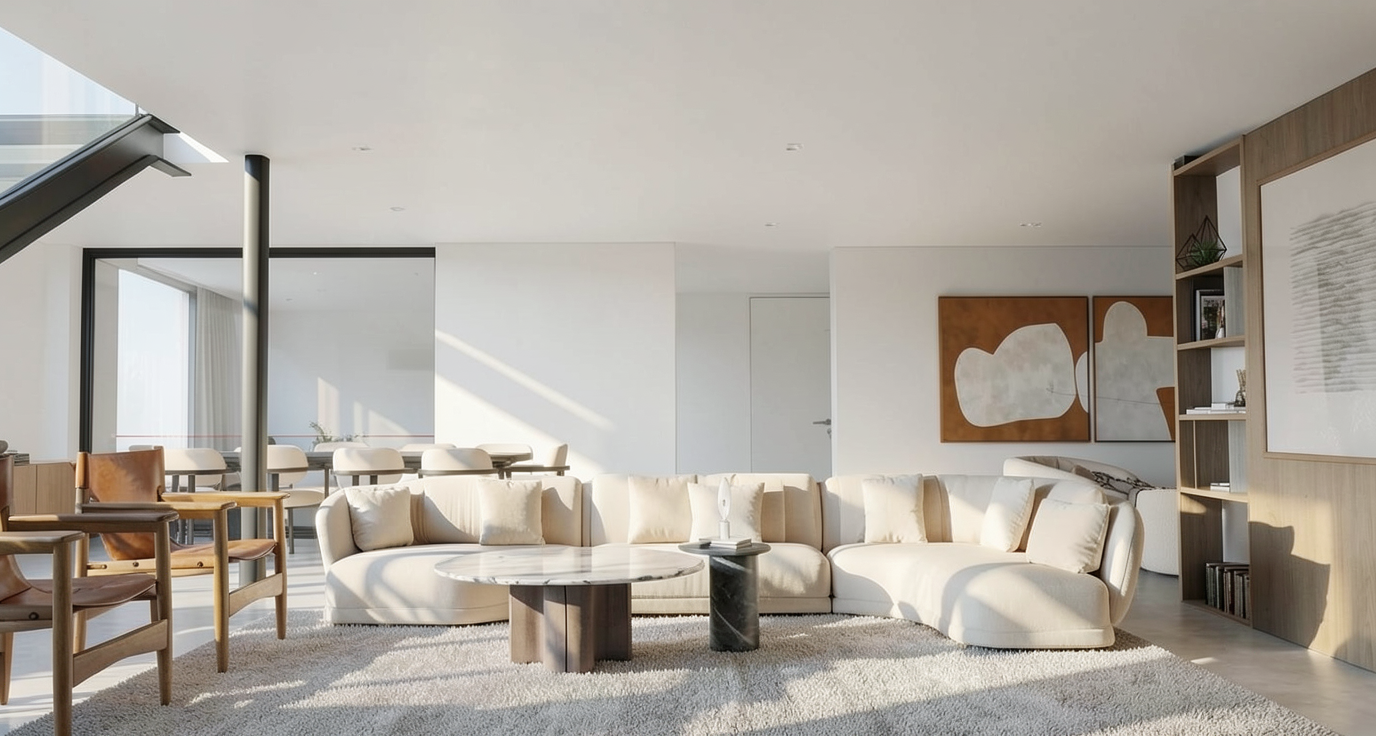 a modern bedroom inside a luxury modular house retrat the bed is on the center of the wall with nightstands on each side and different bed side lamps on the right there is large corner window and a hidden bathtub behind the wall with the bed you can see the bathtub partially the floor under the bathtub is covered with small white stones and the bathtub is surrounded by tropical plants on the left side of the bed there is the door for the bathroom the floor of the bedroom is made from hardwood floor natural tone with cracks and wear areas to look more realistically the walls are cladded with a with a bumpy textured surface that looks like sand dunes beige and earth tones design the rooms must look like a very instagram post ready bedroom there are hidden led strips in the wall on the right side there are very large floor to ceiling windows and there is warm sunlight with warm shadows the roof is slanted on the left is lower and on the right is taller all elements have sharp details the bathtub is on the same level with the bed the room is wider and you can reach the bathtub by going around the area with the bed to the right