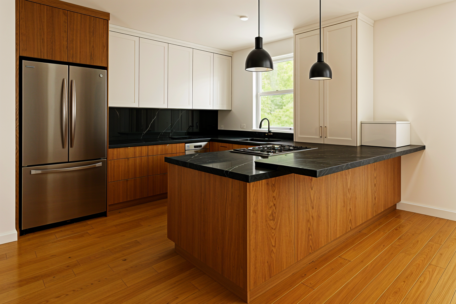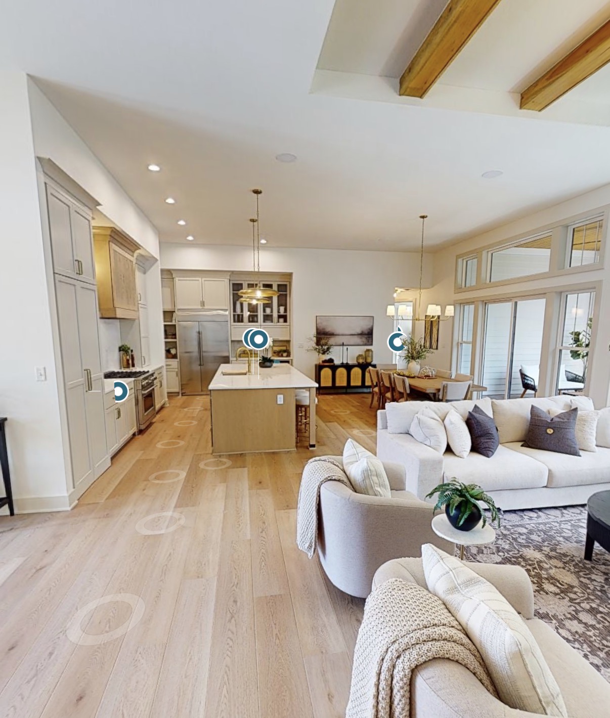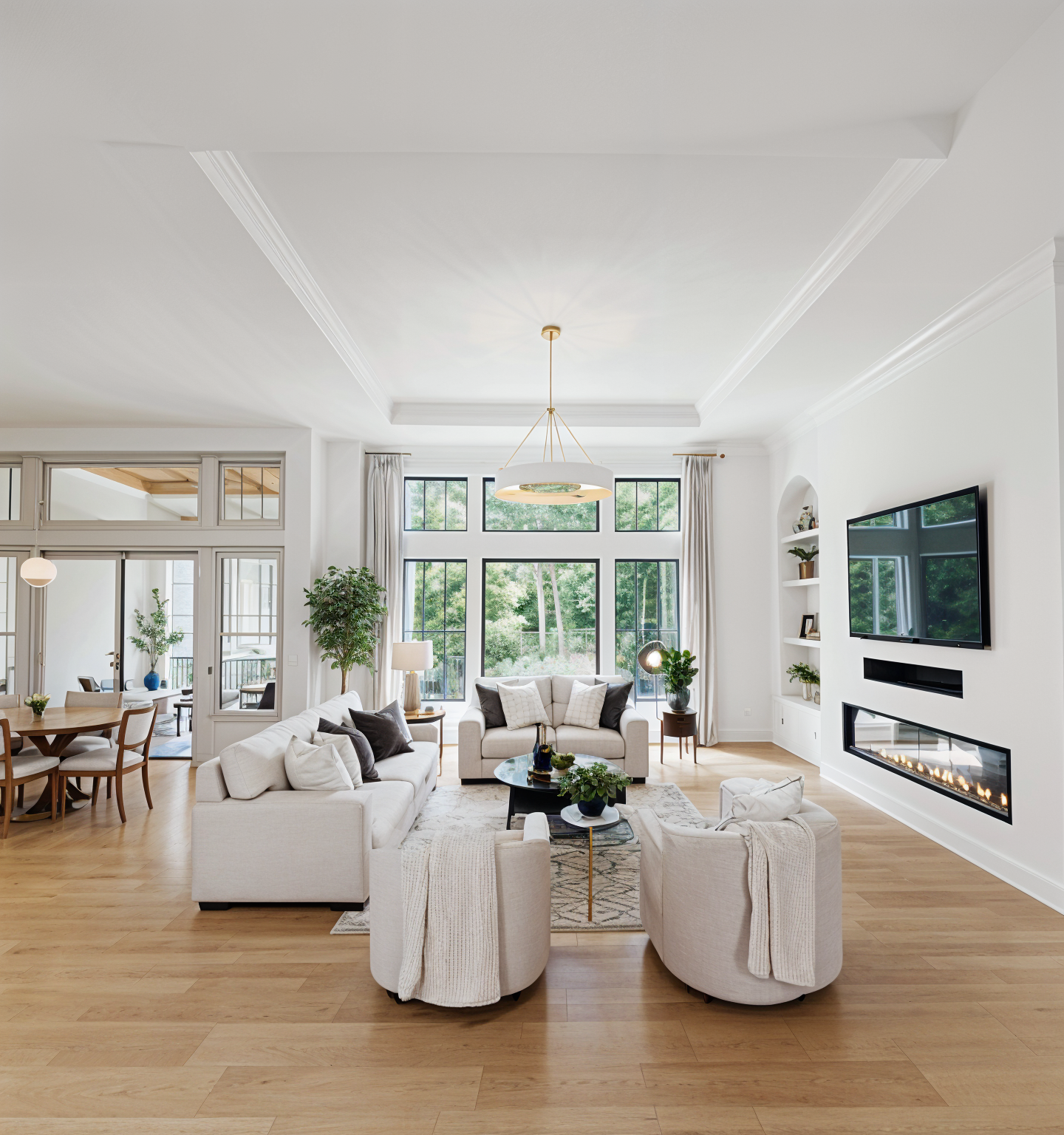 change all of the windows and doors to black surrounded by white wood trim remove the grids from the windows change the floors to extra wide plank european white oak remove the beams from the ceiling make the tray in the ceiling larger and add crown detail to the tray and ceiling add waterfall countertop to island
