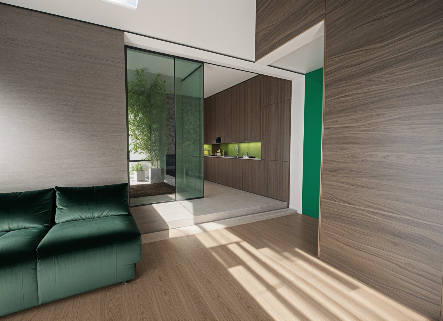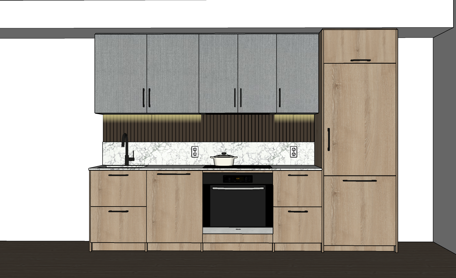interior shot render a realistic modern kitchen interior based on this design base cabinets light natural wood finish with simple flat panels and matte black handles tall cabinet right same light natural wood finish full height with integrated refrigerator look black handles upper cabinets matte grey textured panels with slim black vertical handles countertop and backsplash continuous white marble with subtle grey veining back panel above backsplash vertical dark brown wood slats lighting under cabinet warm led strip lighting that highlights the backsplash appliances black built in oven with stainless steel trim integrated cooktop above modern black faucet and sink accessories white cooking pot on the stove floor dark wood flooring the scene should be photorealistic with natural lighting and soft shadows while preserving all materials colors and proportions exactly as shown architecture