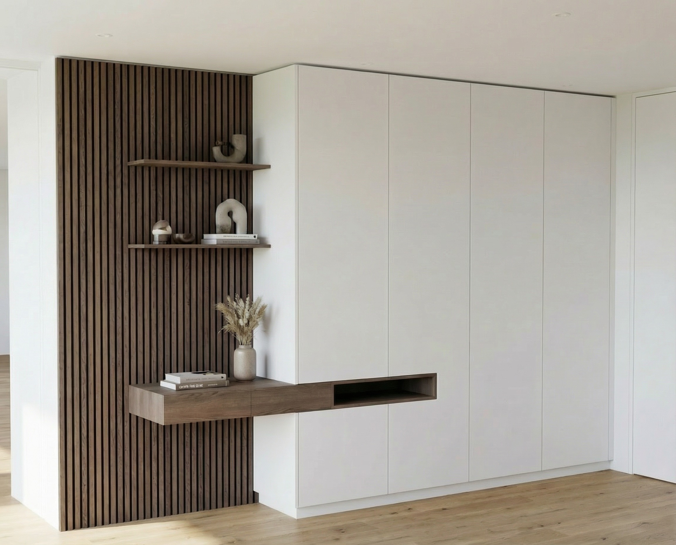 refine only the decoration elements in the scene keep architecture furniture shelves and materials completely unchanged add subtle high end decoration inside the niche minimal and elegant objects such as books or sculptural pieces clean composition slightly enhance the flower bouquet with more natural color variation soft and elegant tones not too bright maintain overall calm and neutral interior styling no additional furniture no changes to shelves wall panels wardrobe or lighting photorealistic preserve original image minimal changes