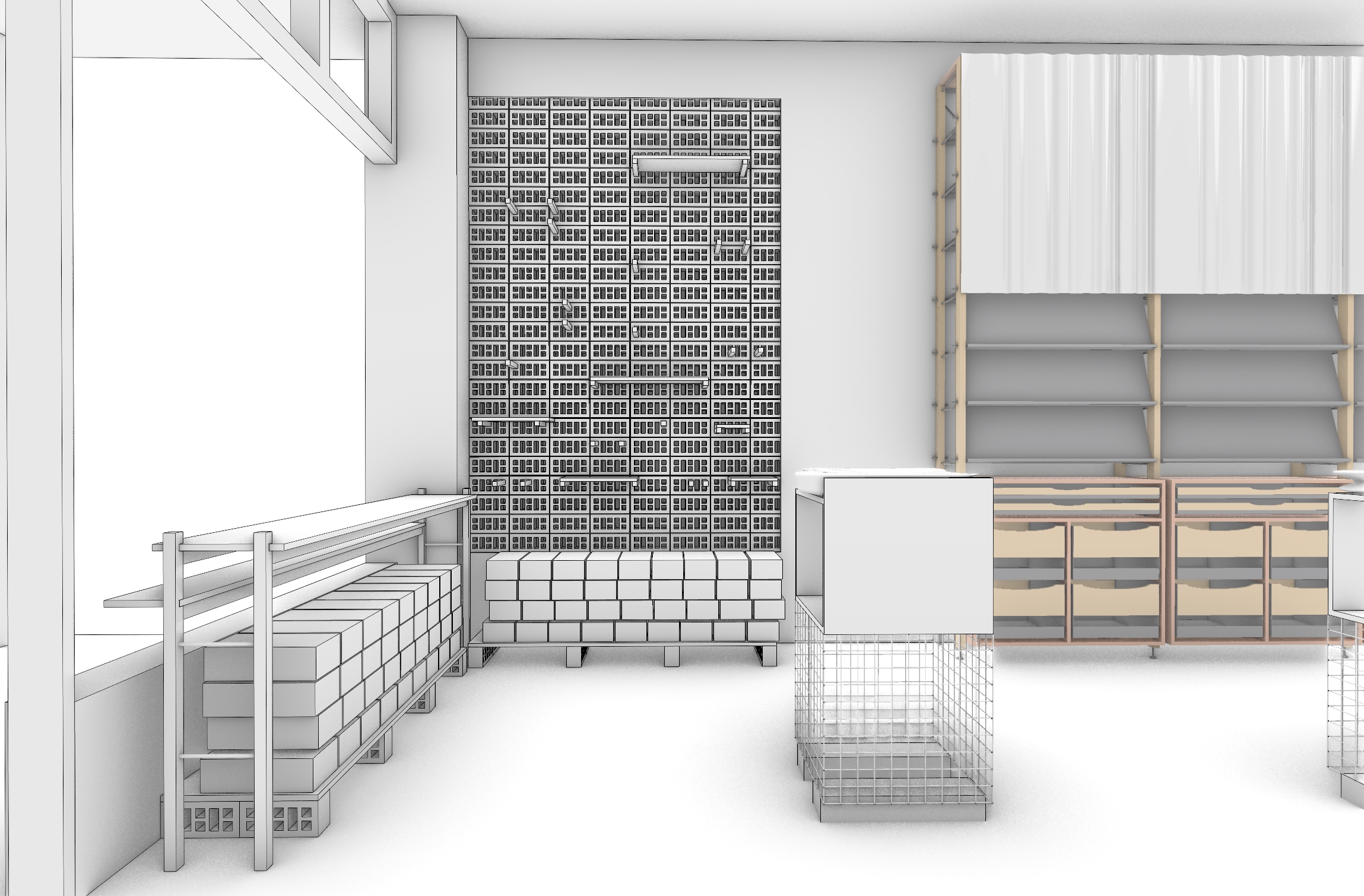 interior rendering of a ceramics supply store in cape town based strictly on the provided 3d model geometry do not change layout or proportions scene description match model exactly view from inside the store looking towards the shelving wall flooring muted wooden vinyl flooring running along the long side of the space left side full height terracotta brick lattice wall in front stacked rectangular clay bricks on the floor center two display plinths base gabion baskets made of metal mesh filled with stones middle open plywood box shelf top thick natural stone slab back wall long continuous shelving unit lower section plywood drawers upper section recessed niches inside niches slanted shelves made of galvanized steel shelves display ceramic glaze tiles above shelving soft linen textile panels hanging to the ceiling slightly irregular off white right side pos counter with curved front base gabion basket filled with stones top clean plywood countertop wall mounted shelves behind pos far right seating nook built in plywood bench with solid ash seating surface small chair coffe table with a stone slab as a table top ceiling exposed track lighting system running longitudinally left side clay brick wall with wooden pegs inserted generating space for displaying tools and objects suspended from the pegs materials very important make materials realistic and tactile plywood light visible grain matte finish solid ash wood slightly warmer tone than plywood galvanized steel shelves slightly reflective industrial finish gabion baskets metal mesh with irregular natural stones inside terracotta bricks warm slightly rough texture stone slabs heavy natural slightly uneven edges linen fabric soft slightly translucent subtle folds ceramic tiles varied glaze finishes glossy matte textured avoid plastic or overly clean surfaces lighting only from the track lighting track lighting with spots on the shelving units and plinth highlighting shelving wall soft shadows atmosphere calm tactile craft oriented space slightly raw not overly polished balance between workshop and gallery emphasize material contrast rendering style ultra realistic architectural interior rendering high detail global illumination natural materials soft shadows no people no clutter clean but not sterile