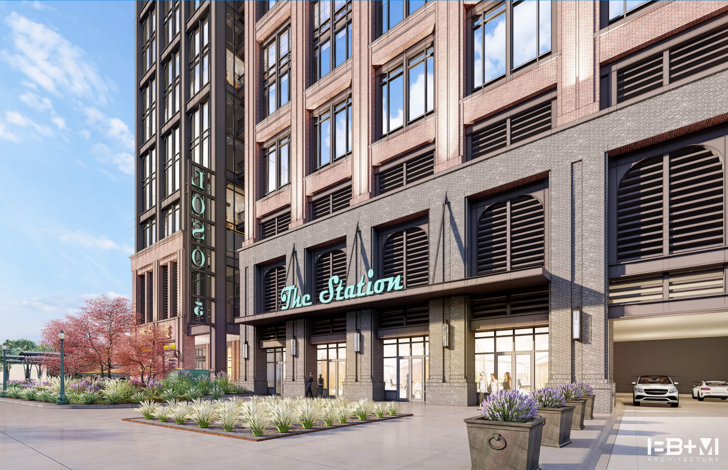 active office building rendering improve materials sunset gradient sky wet streets landscaping