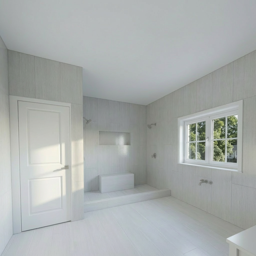 keep everything exactly the same in the rendering do not change the layout walls doors windows shower niche plumbing fixtures wall tile lighting vanity or any materials only change the color of the tile floor and wall to make them more white but keep the texture the same and make the texture a more prominin on the white so you can see it on all the tiles floor and walls reduce the number of grout lines so the tiles appear large format keep the floor tile layout straight or in a staggered pattern do not change the tile material color layout keep everything else exactly the same make the final image look like a realistic photo rendering with natural lighting and soft shadows