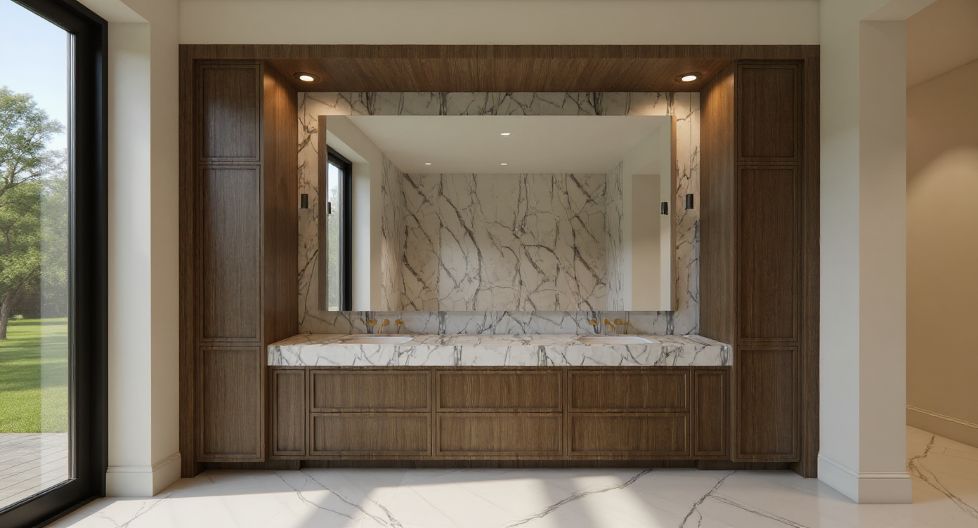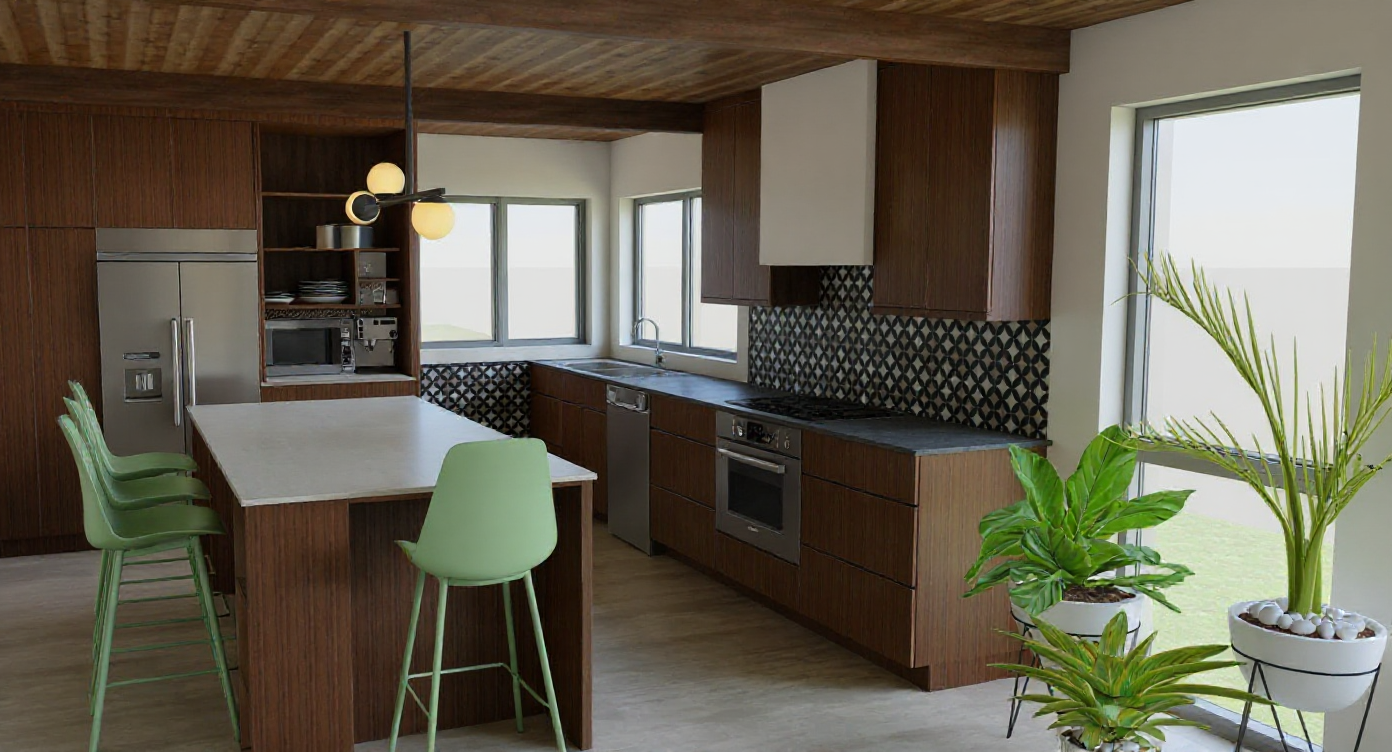 make this look realistic warm brown cabinets white countertops with simple veining take the lines off the appliances