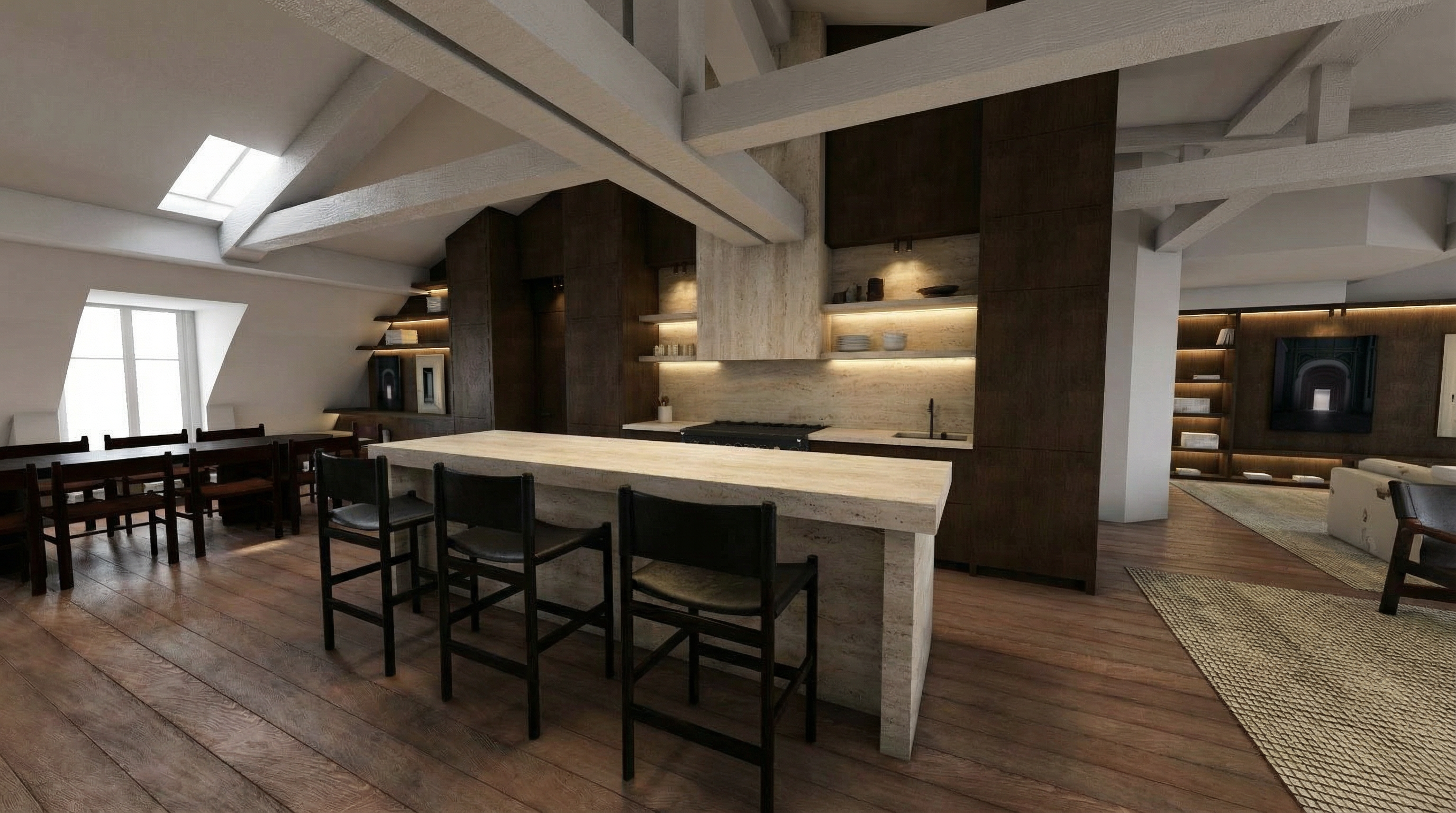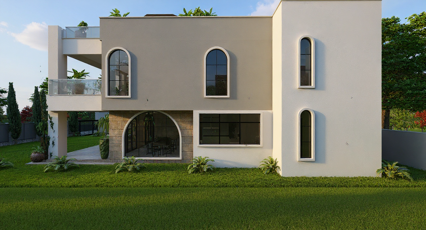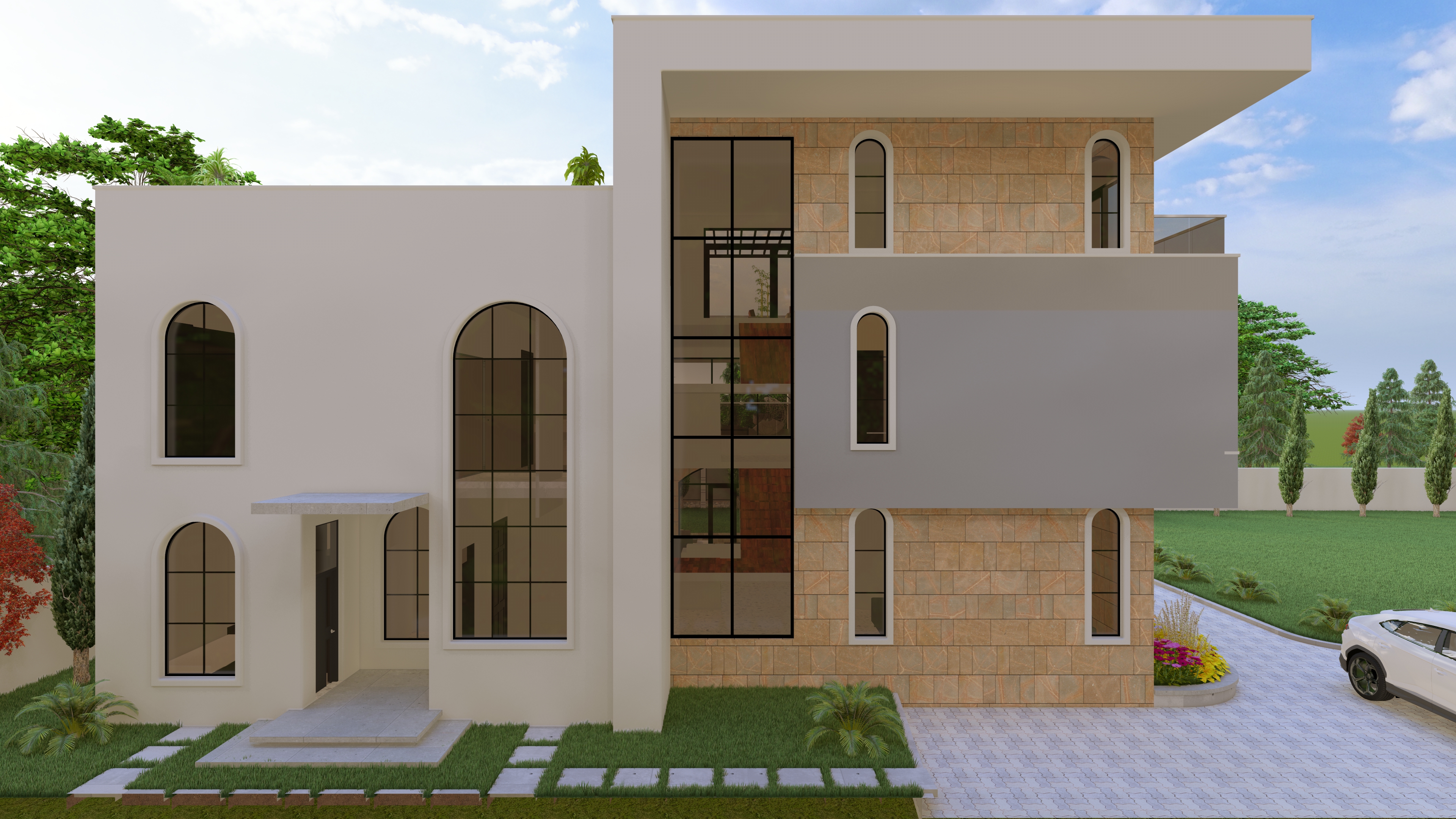 this is a modern mansion with white finished plaster surfaces gray paint on finished plaster 1st floor the wall on the right side and stone finished surfaces keep all materials as they are enhance texture add indoor warm lighting brighten the scene with daylight the windows and doors should have curved tops as they are no adjustments on shapes of any elements