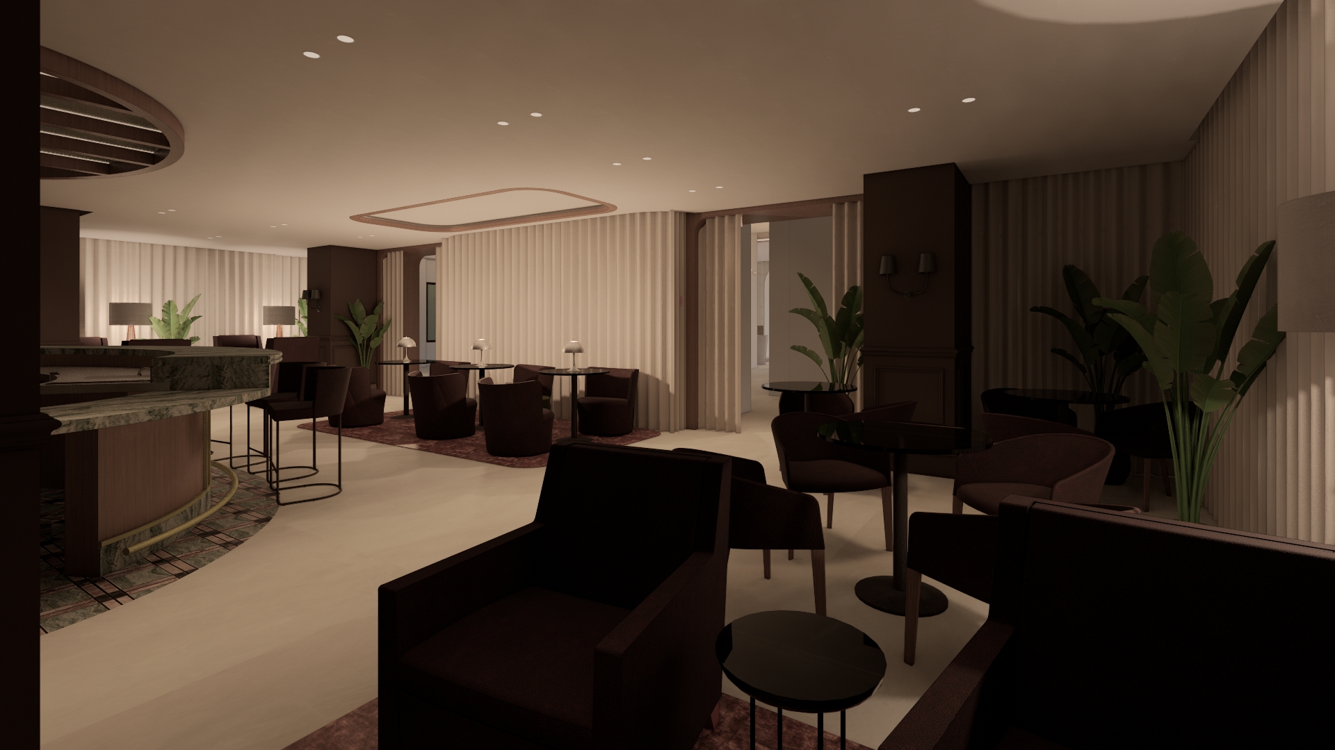 add one bartender behind the bar preparing drinks and interacting naturally while preserving the bar s structure and alignment stools should appear upholstered in brown leather with subtle natural sheen and cushioned tactile texture include guests seated at the bar add premium alcohol bottles arranged tastefully to bar shelves keep all materials as they are bar light should be moody