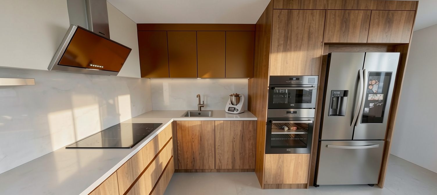 make window frames white add backyard scenery behind windows add a saucepan on the range add one single food item to the island add one utensil holder next to the range