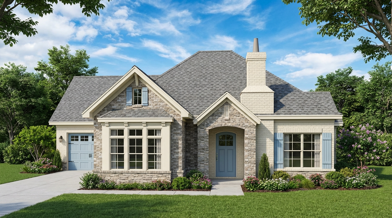 create a realistic image add 2 3 small birds no more in the sky add some modern houses with flat roofs in the background ad a men with a child on a right side infront of the garage