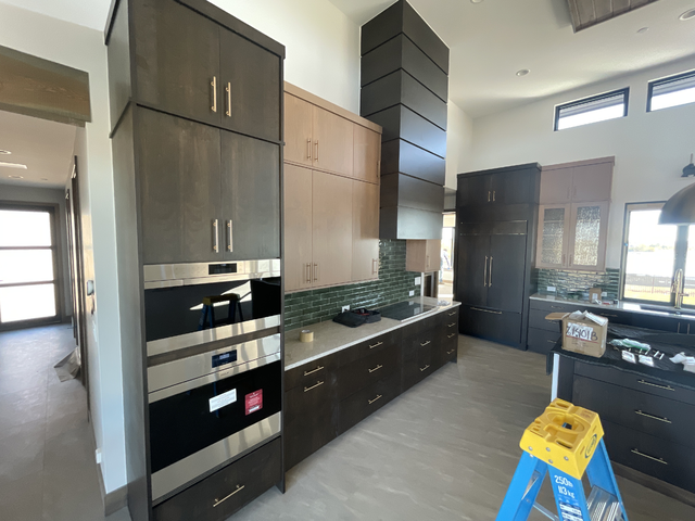 do not change the cabinets in any way preserve the exact cabinet colors materials finishes dimensions door and drawer styles hardware spacing alignment and all geometry exactly as shown do not alter the countertop shape backsplash appliances flooring lighting fixtures or wall structure only remove the construction materials clutter and mess from the scene clean the room and make it look finished and staged add a few simple tasteful home accessories appropriate for the style of the space but do not add or remove any furniture windows or architectural elements maintain the original lighting direction and realism enhance clarity and polish the photo while keeping the cabinetry and room design completely unchanged do not alter the lighting to keep the cabinet colors as they are in the image stage for a modern kitchen remove stickers on appliances add simple views out all windows