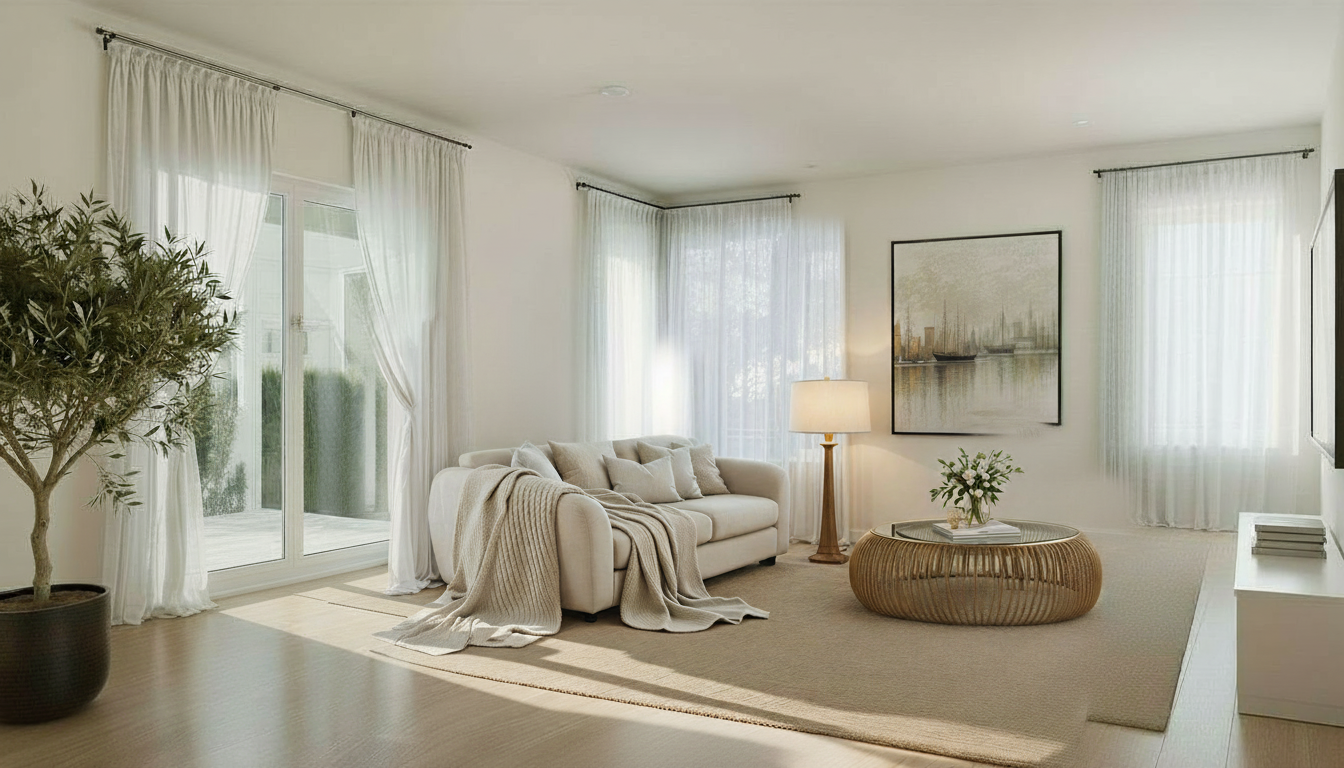 interior shot render a modern minimalist kitchen corner with sleek white cabinets and drawers featuring elegant matte black countertops add a sophisticated stainless steel faucet design with a warm and inviting atmosphere emphasizing soft natural lighting through large windows use light gray walls to complement the sharp white cabinetry include a reflective polished gray tile floor to enhance the modern aesthetic the sky outside the windows should have soft serene blue hues with gentle wispy clouds to create a peaceful ambiance