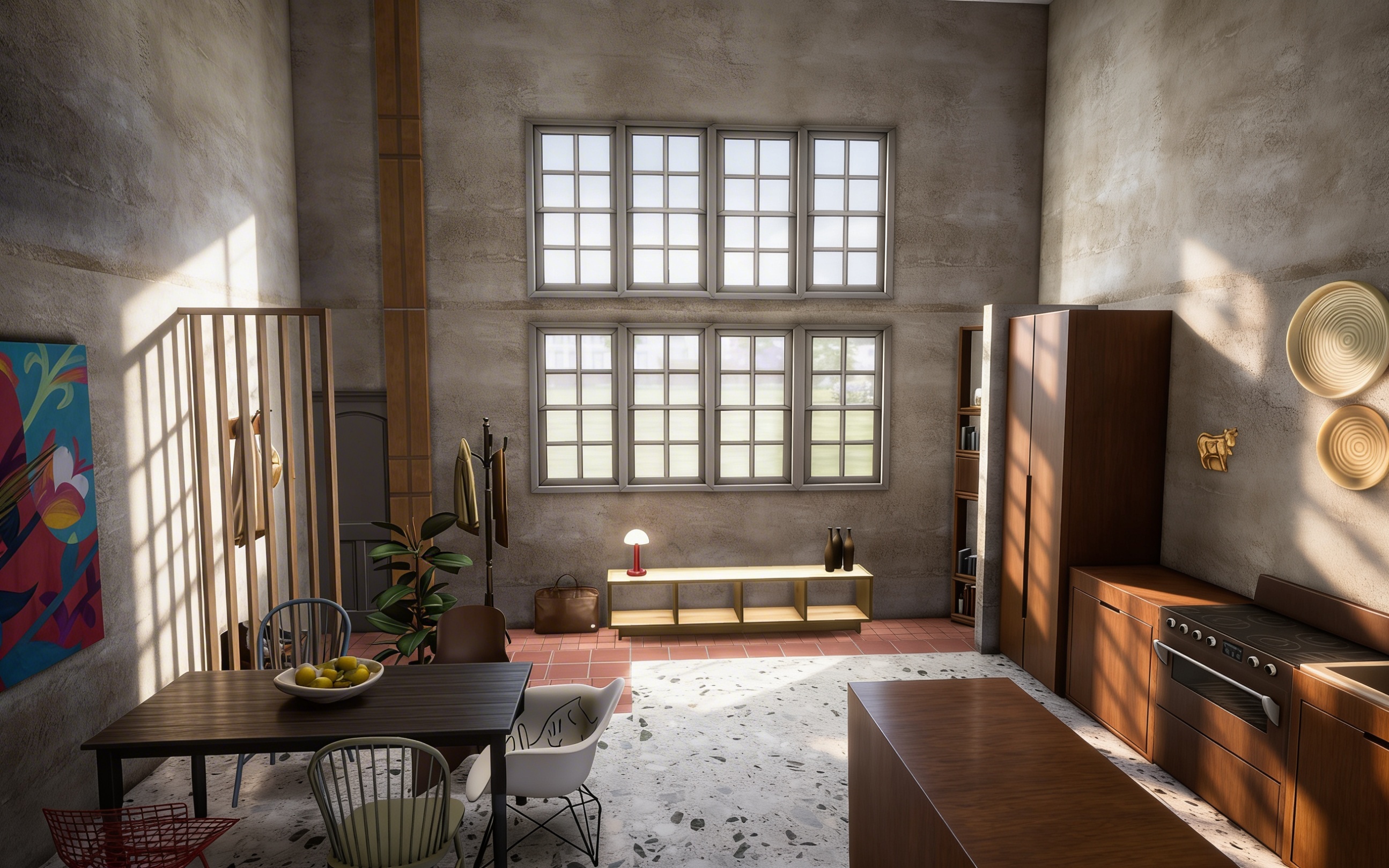 generate a high resolution photorealistic photograph shot on a modern full frame digital camera canon eos r5 or sony a1 based on the uploaded image strictly preserving the original composition camera angle framing positions of all objects props characters and background elements as well as the exact spatial relationships and scene layout maintain the same overall structure perspective and narrative context from the reference convert the image into a hyper realistic scene with lifelike textures materials and details render all surfaces with accurate photo and physical realism preserve the original color scheme textures and material appearances exactly as depicted in the drawing but elevate them to photographic quality without altering hues saturation or patterns use soft natural daylight similar to professional architectural photography with gentle shadows and subtle global illumination the lighting should feel warm natural and realistic