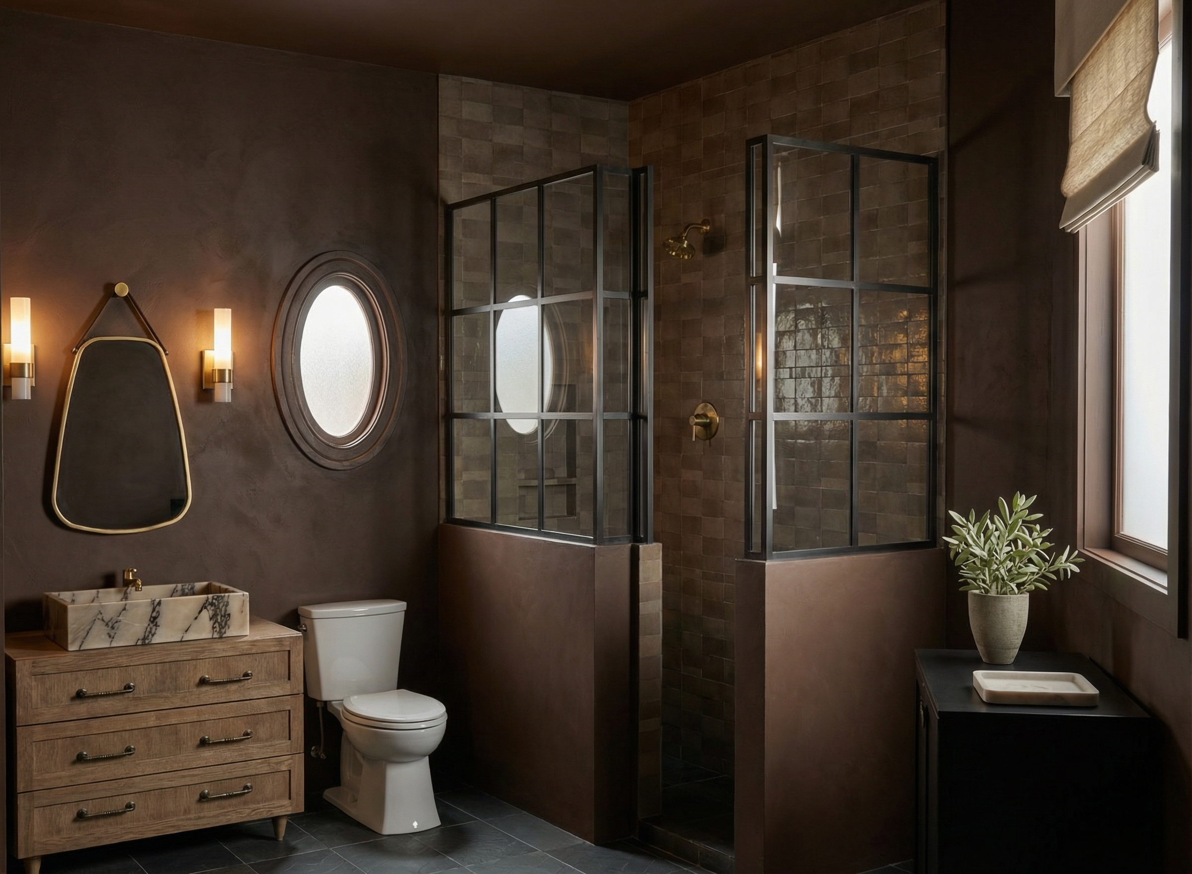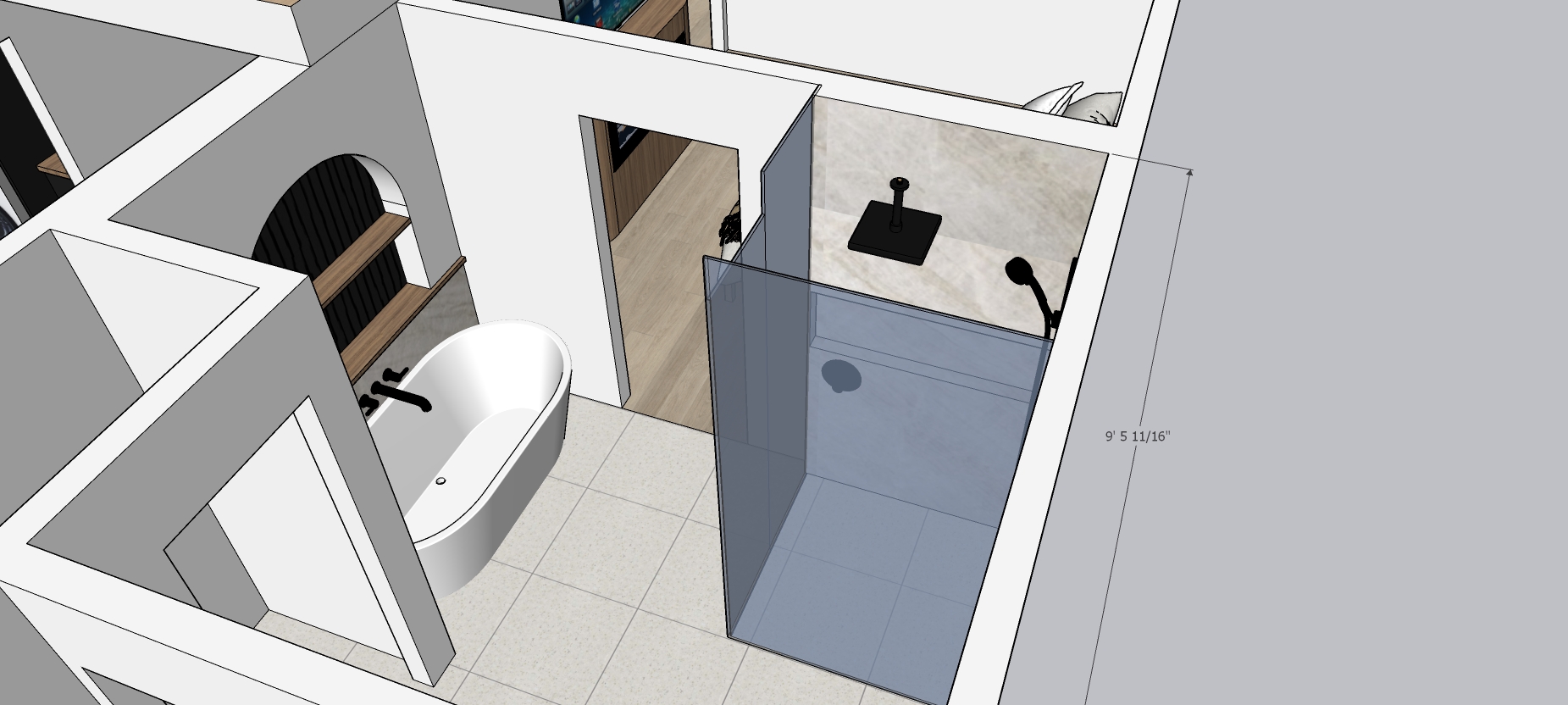 night view with light over tub and shower niche lighting