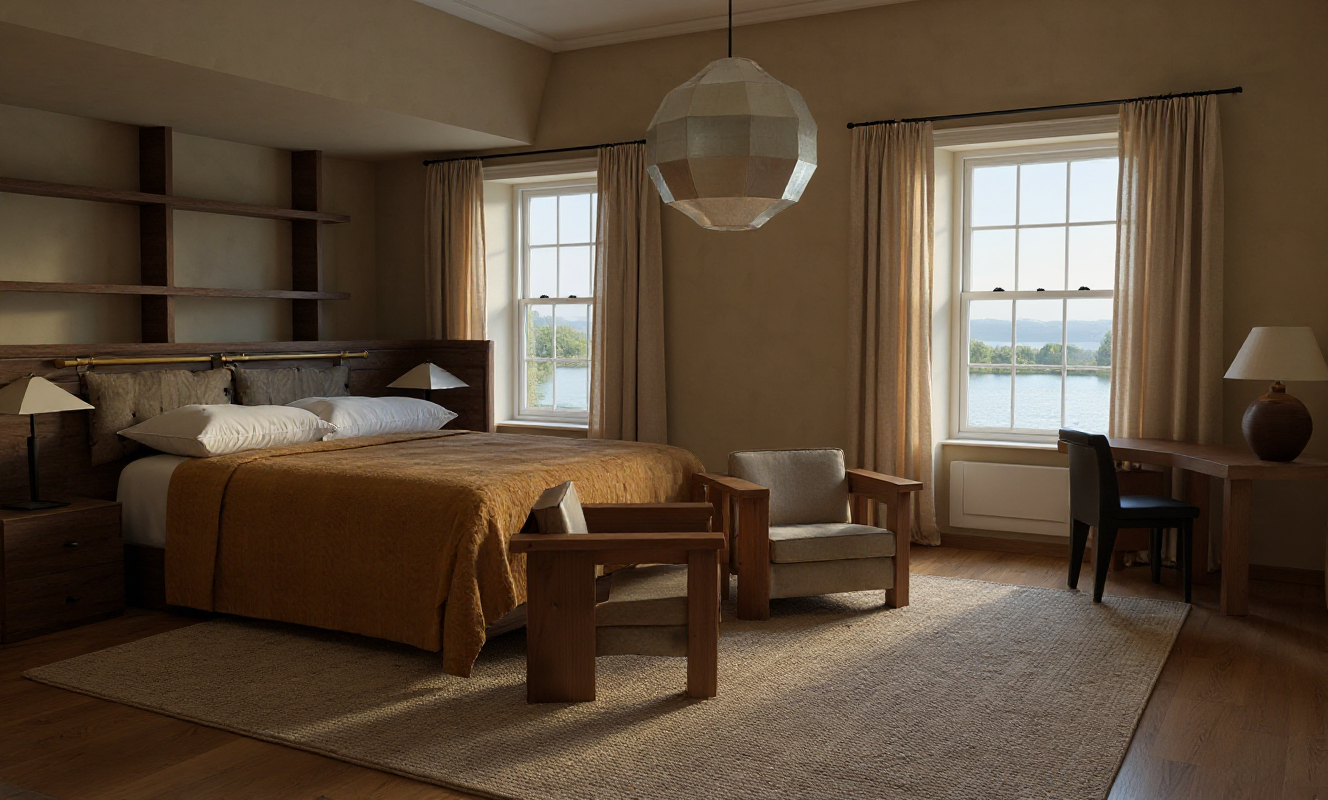 photographic interior with realistic proportions and details a bedspread fully covering the entire bed including the pillows smooth continuous fabric surface across the mattress and head area wide bolster cushions added beneath the bedspread creating gentle form at the head of the bed in muted teal linen calm exterior view beyond the windows with landscape set back at a natural distance soft natural interior lighting realistic exposure