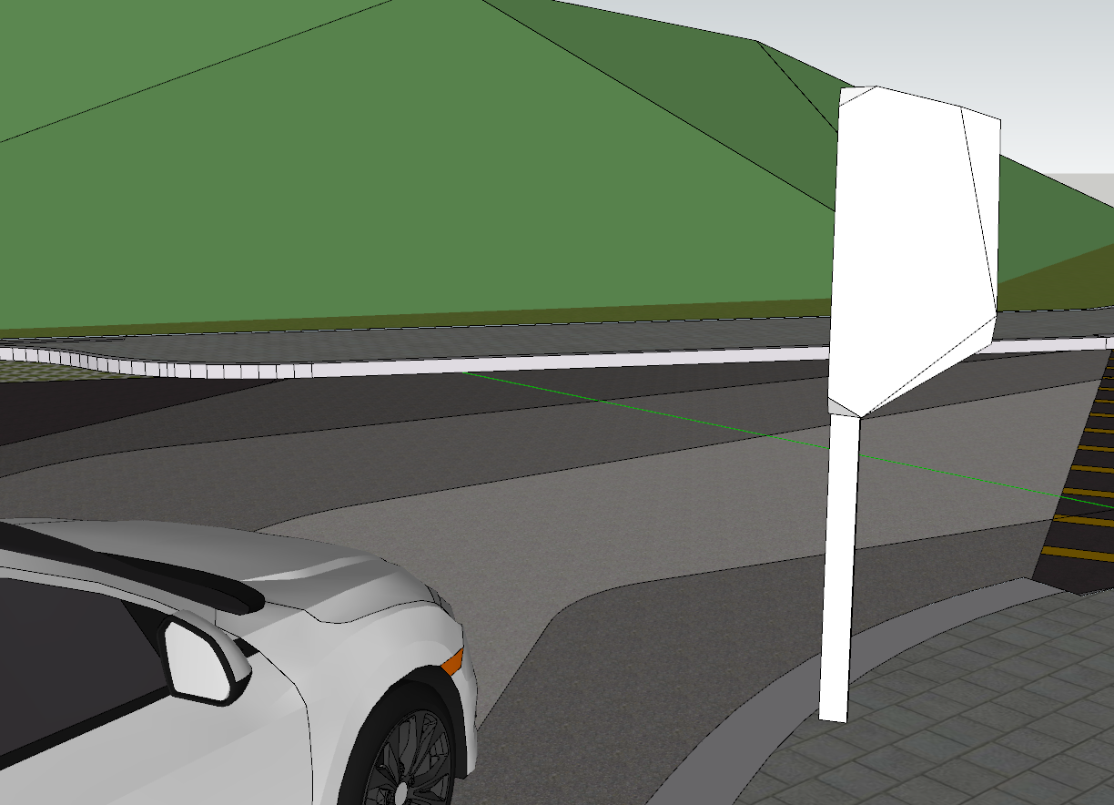 convert this signage design graphic into a realistic 3d external pole signage display it in a dynamic perspective view positioned by the roadside with a partial view of a car beside the signage for scale the signage panel is made of aluminum with a hairline rose gold finish featuring soft bends as shown in the shading of the design reference the supporting pole is finished in black semi gloss paint surround the area with trees and shrubs for environmental context and realism signage dimensions 540 mm wide 2250 mm tall render in archysynth architectural realism natural daylight cinematic tone soft shadows accurate reflections and photorealistic material detailing