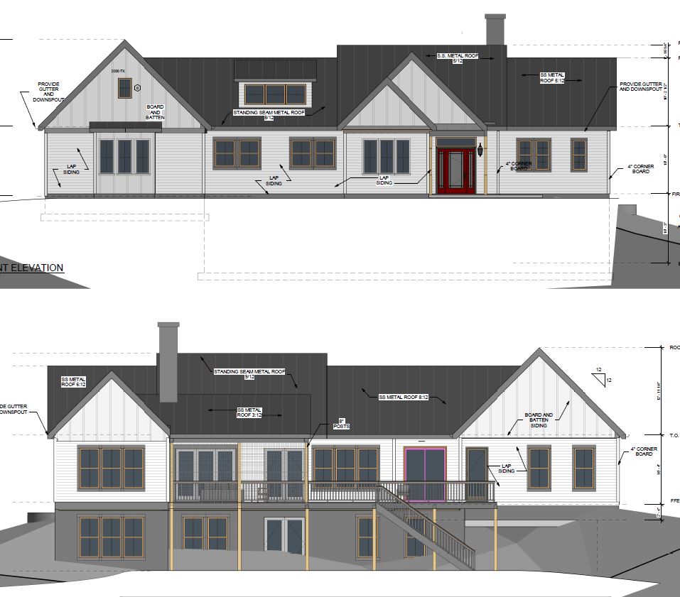 enhance architectural elevation to a clean professional render remove all text notes callouts and hide any footer or annotation overlays smooth topography and landscaping sharpen structure lines and improve proportion clarity walkout basement on bottom elevation and one level entrance on top elevation enhance exterior material realism including standing seam metal roofing with crisp seams high contrast board and batten siding and smooth lap siding with natural light shadowing improve texture detail and depth add subtle highlights and soft reflections natural daylight realistic shadows neutral sky photorealistic tone keep original geometry layout and massing true to the design