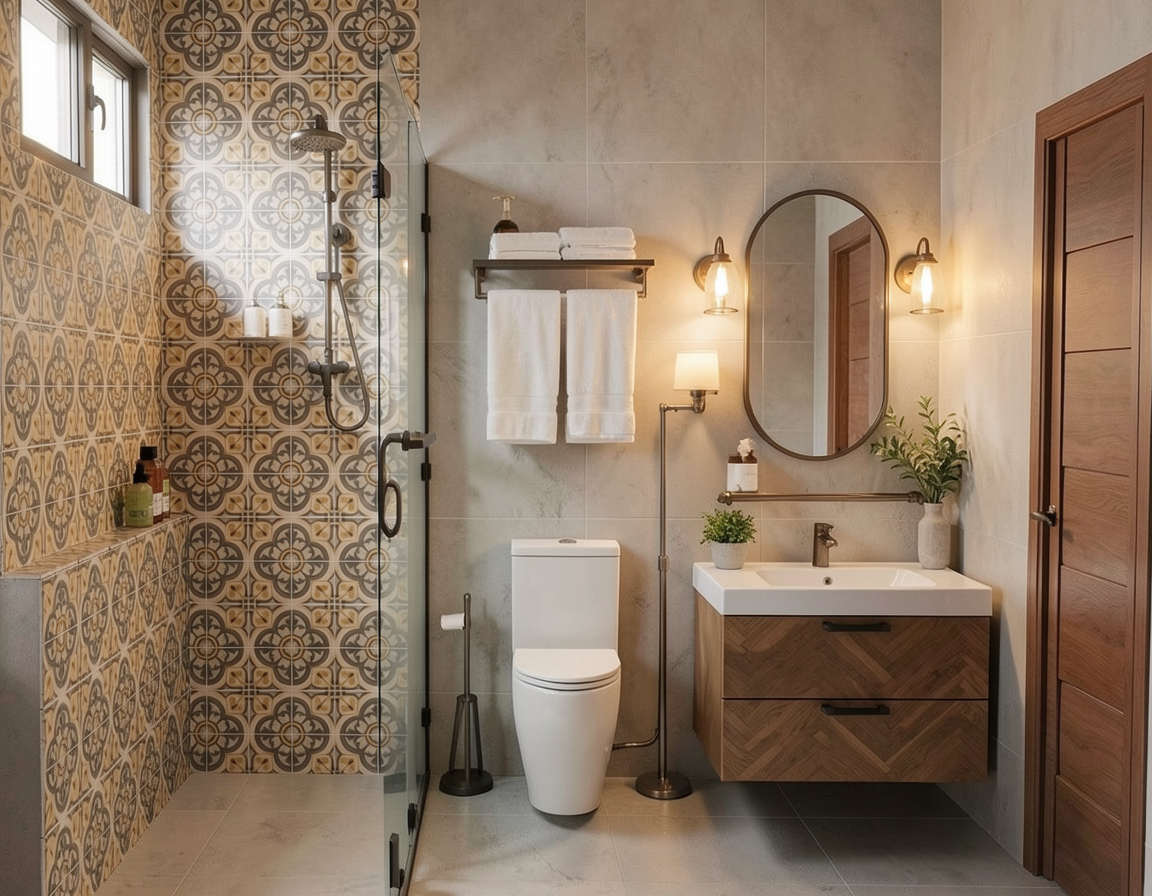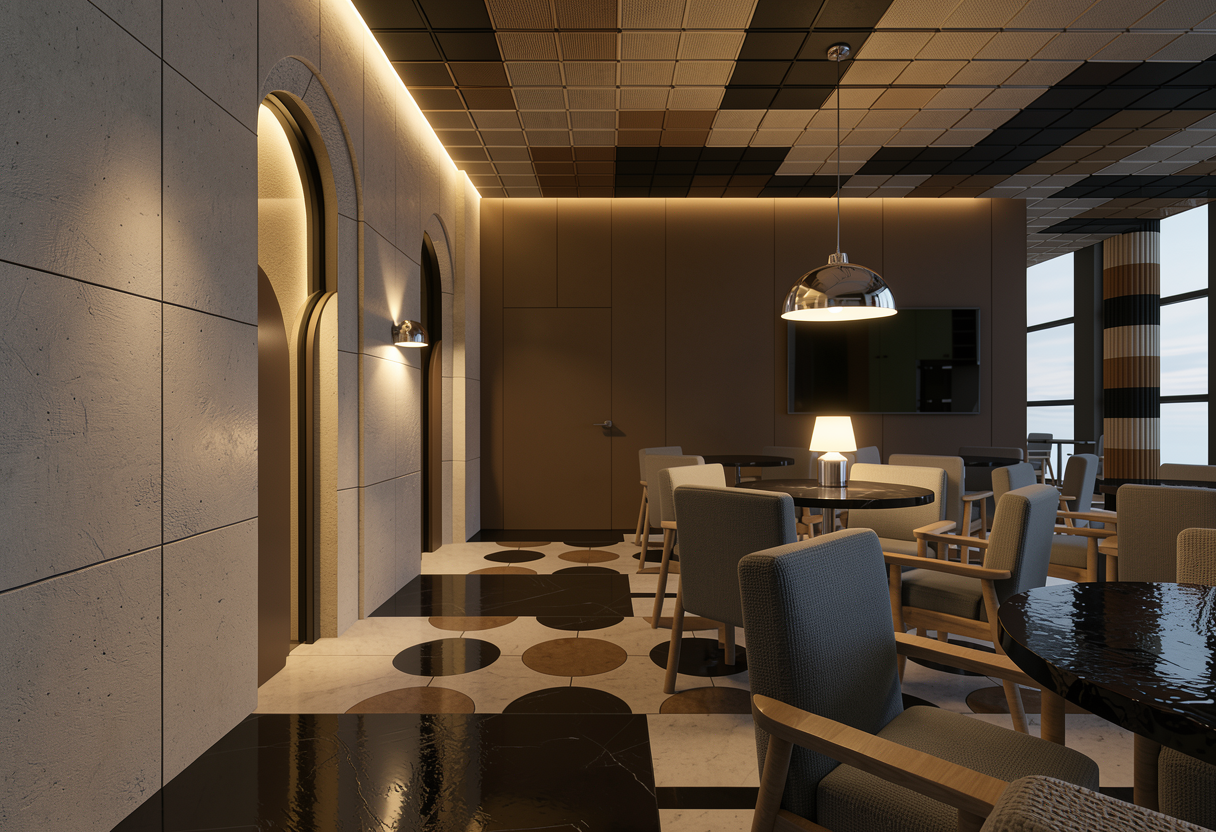 ultra realistic architectural render of an industrial public restroom interior two toilet stalls are visible through door openings framed with bright industrial yellow metal frames the surrounding wall is gray brick masonry with subtle texture and realistic mortar joints inside the stalls the partitions are concrete panels minimal and robust with visible imperfections the floor is polished concrete with a safety warning stripe running along the corridor black and yellow hazard striping painted on the floor each stall contains a matte black wall mounted toilet modern and minimal creating strong contrast with the light materials of the partitions and walls the ceiling is a black metal grid ceiling system with round recessed spotlights integrated into the grid which are the only light sources in the space lighting should be soft realistic warm yellow notes and slightly directional casting subtle shadows on the brick wall and partitions the camera view is straight on symmetrical architectural framing showing two adjacent stalls materials should feel authentic brick powder coated door frames matte black ceramic toilets raw concrete floor and partitions style contemporary industrial architecture minimal public restroom design rendering style high end architectural visualization photorealistic materials global illumination subtle ambient occlusion soft shadowing important constraints keep the original architecture and proportions do not add decorative pipes or additional elements do not change the layout do not alter the volume