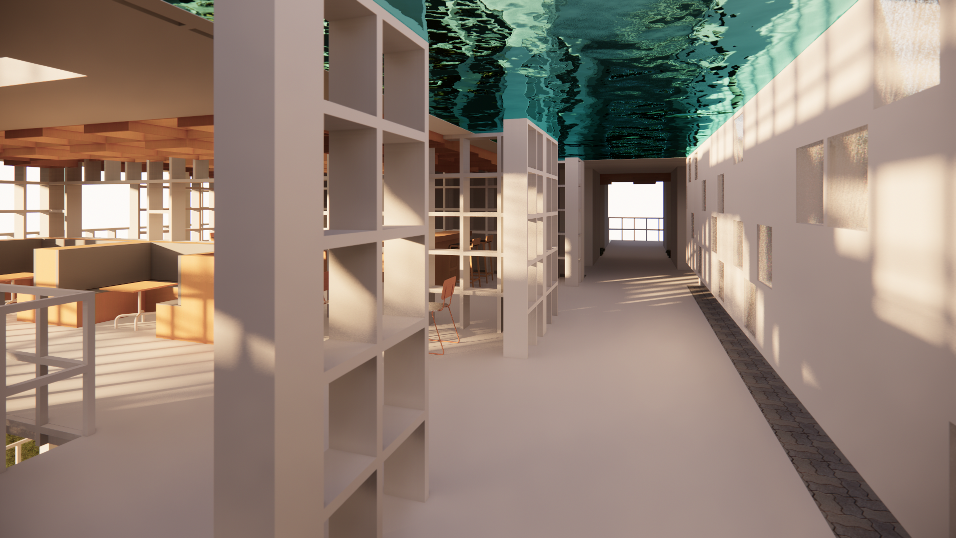 modernist interior shot this is an interior design there are waterpound on the roof pls show the refection of water on the ground architecture
