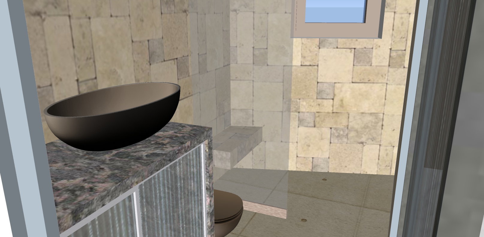 a beautifully rendered bathroom with a serene and minimalist design the walls are covered in textured beige stone tiles adding a natural and elegant feel the countertop is made of polished granite with subtle hints of pink and gray the vessel sink is a smooth matte black providing a striking contrast against the countertop the floor tiles are a light sandy beige creating a seamless transition from the walls a small window allows soft natural light to enter casting gentle shadows and enhancing the warm ambiance the atmosphere is calm and inviting perfect for a relaxing retreat