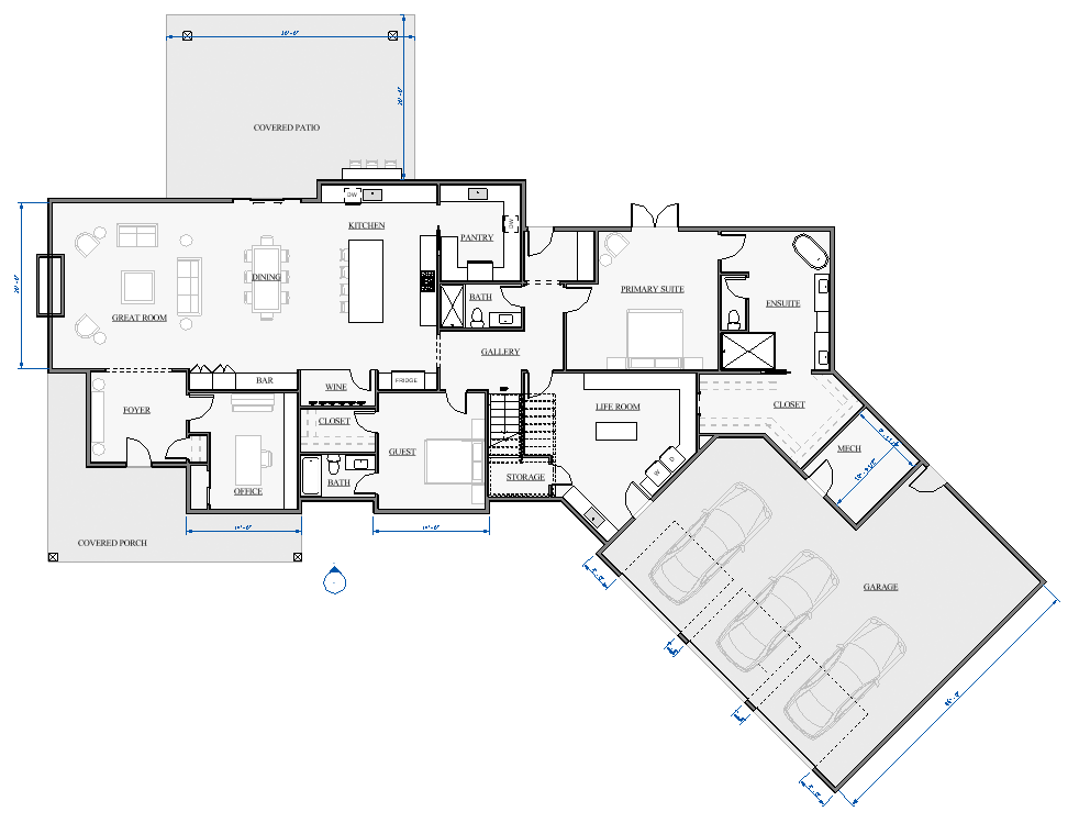 convert this floor plan into a realistic isometric 3d view of a full house show the space from an elevated angle with furniture walls and details visible render a detailed and beautifully designed floor plan of a modern house use a color palette of soft whites f3f3f3 for walls and ceilings warm beige e3dac9 for the floors and light gray d1d1d1 for countertops and other surfaces incorporate dark wood tones 2c2014 for furniture and accents the steel elements should have a sleek silver finish c0c0c0 create a cozy and inviting atmosphere highlighting natural light include lush greenery through windows to enhance a fresh airy feel add soft shadows for depth and dimension use the same furniture as shows on the plan do not change the orientation of the floorplan