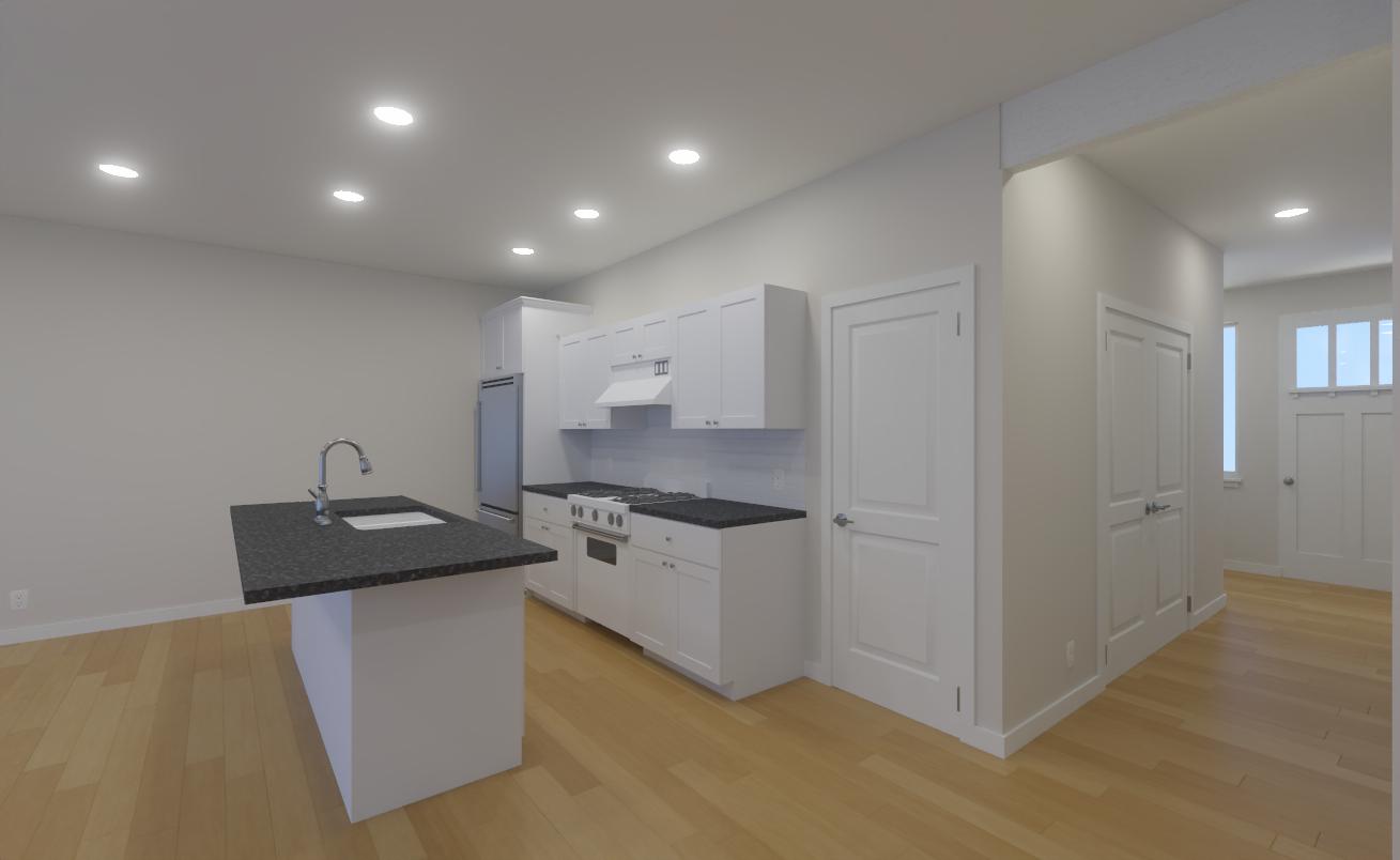 interior shot white kitchen cabinets with shaker style doors quartz countertops with tile backsplash laminate wood style floors white painted trim and doors textured and painted walls and ceilings