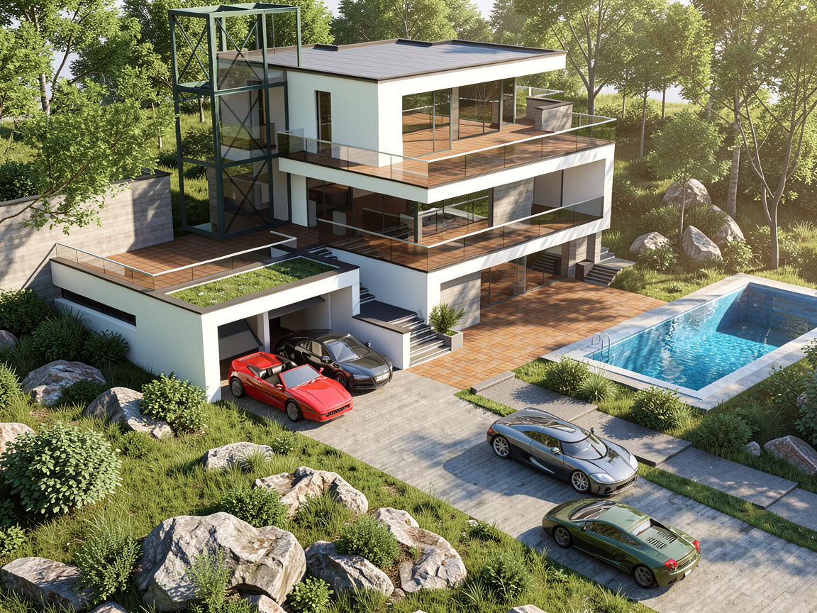 render a photorealistic 3d perspective of this sauna the current material style keep model geometry keep material colours the same windows doors roof walls make a green meadow with moss gray several pine trees do not change relief do not change the view only enhance the current materials and make the landscape nicer vegetation detailed textures in the wood naturally grey siding and a vibrant clear sky with light atmospheric depth render in hyper realistic architectural visualization quality 8k resolution