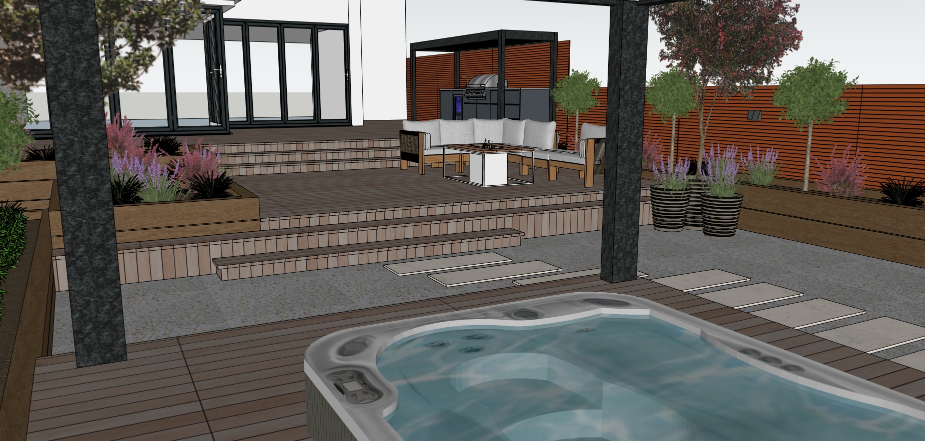 provide a photo realsitic render op the landscaped garden with subtle strip lighting under all stair nosings lets have a shadow heavy partly sunny afternoon the image should be atmospheric almost sepia