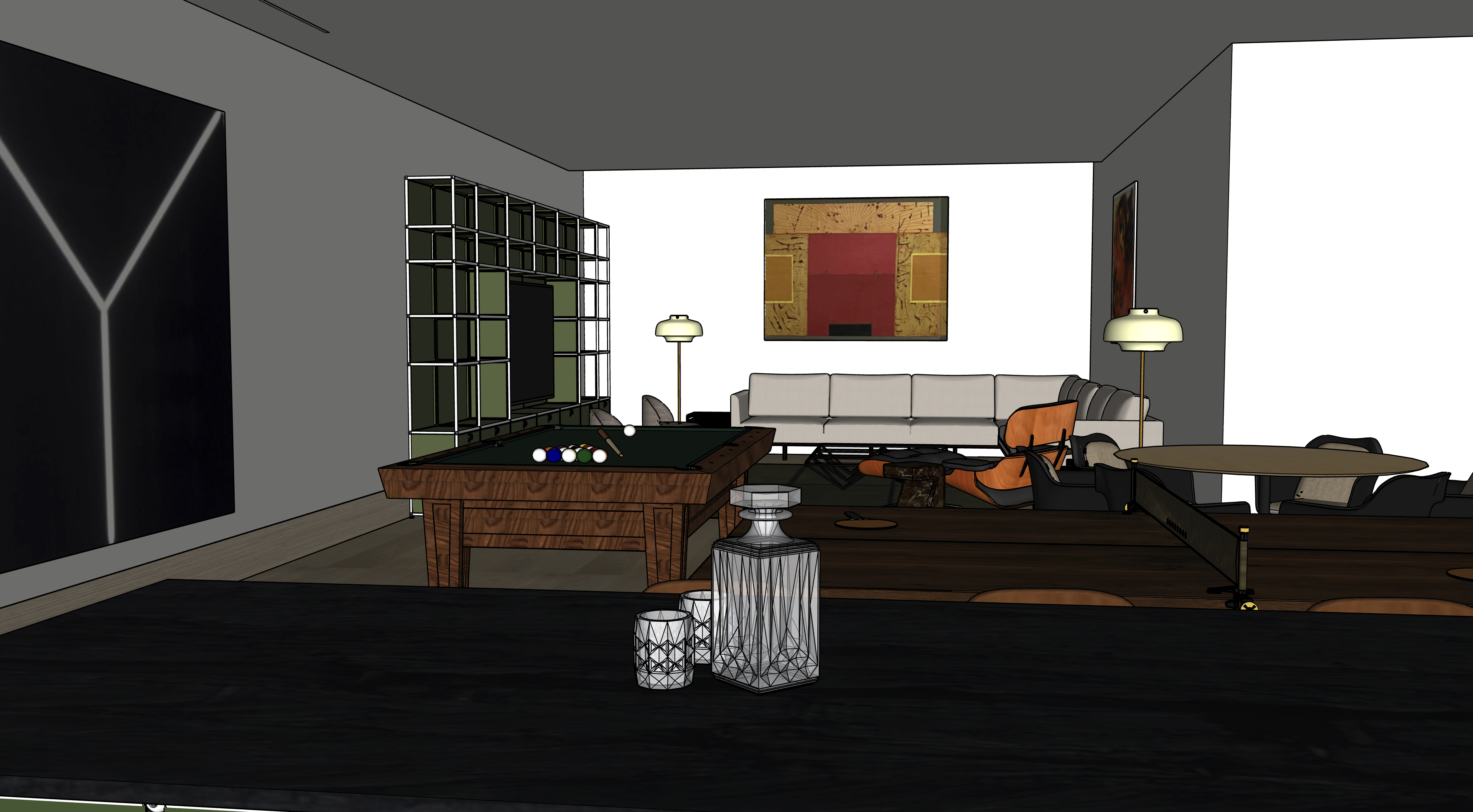 transform the provided game room interior image into a high end photorealistic render with warm interior lighting from lamps or artificial light sources only only no natural light or shadows atmosphere should be soft glowing highlights and relaxed contemporary energy while keeping everything exactly the same proportions same furniture same art lamps should be soft glowing opaque glass shades same materials and same spatial configuration do not move or alter any objects geometry textures colors or furniture positions add books art and minimalist contemporary objects into the tall green bookshelf unit do not add any lamps on ping pong table ping pong table should be a matte black material sofa should be a medium textured gray fabric lighting should emphasize warmth from lamps and overall ambient glow with very minimal shadows shadows enhanced color richness and luxurious catalog level realism improve depth and realism through wood grain richness metal highlights fabric texture and polished clarity while keeping the entire scene exactly as originally designed