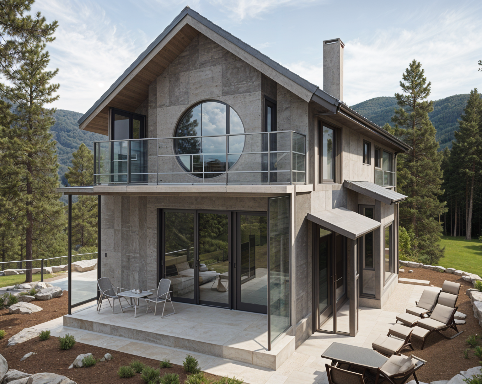 nordic exterior shot a modern two story house at the forest and mountain with large circular window on the upper floor a sleek contemporary design the exterior is constructed with smooth dark gray concrete walls the roof is steep and triangular finished in a sophisticated rust red tone the windows are large with clear glass enhancing the minimalist style include a round window on the upper floor and a balcony with sleek metal railings the outdoor area features a patio with minimalistic black and gray furniture the atmosphere should be calm and inviting with warm soft lighting suggesting a cozy evening setting add subtle greenery around the house to enhance the tranquil ambiance architecture