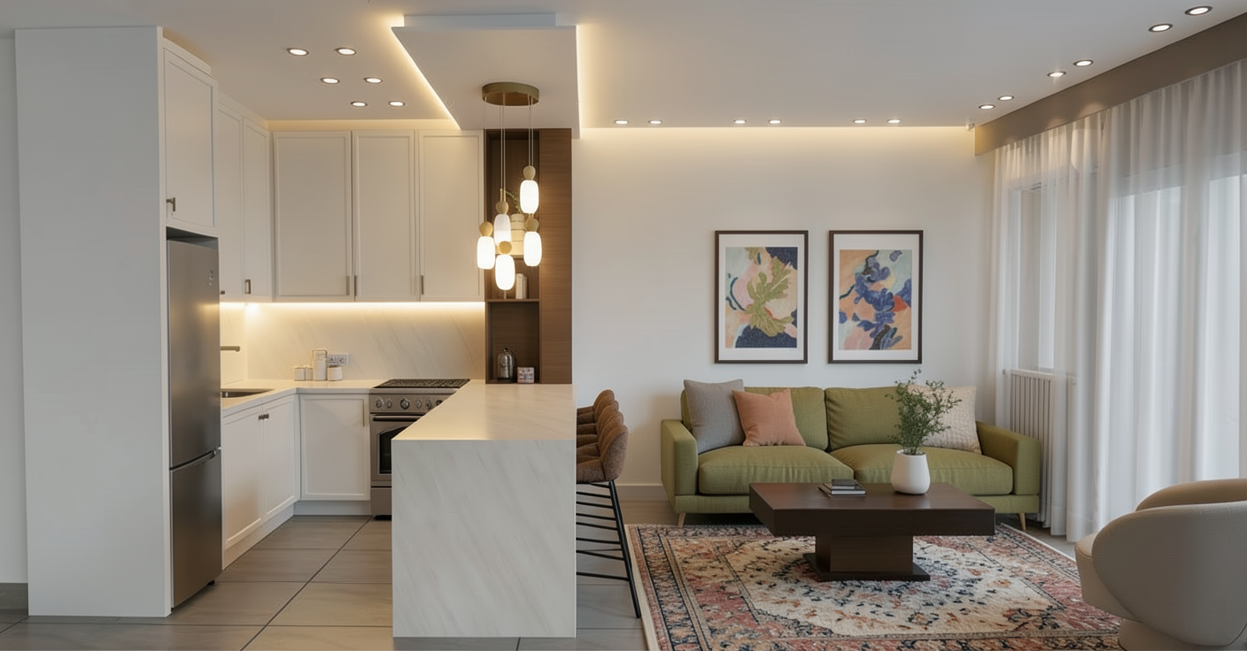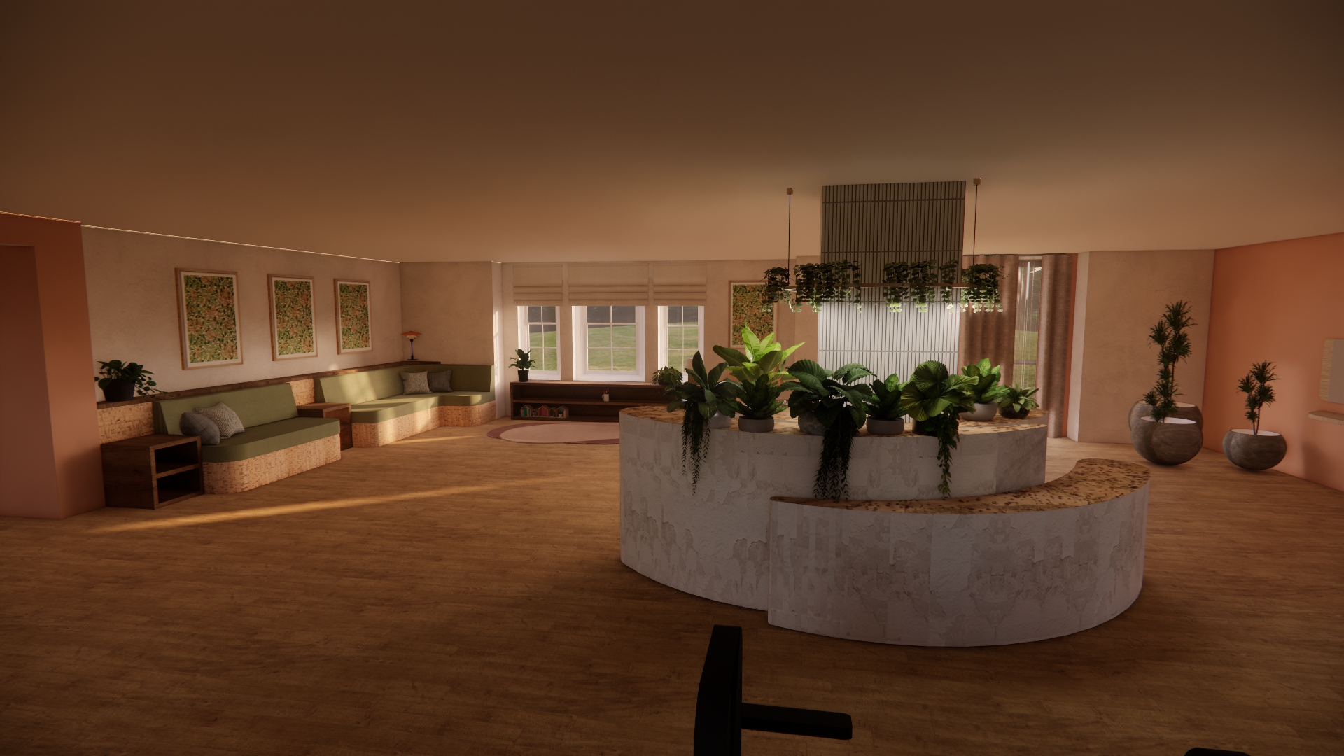 make a photo realistic render add panelled office ceiling with general lighting make the lamp on be very precise with the colours and demotions as in the original render don t add anything