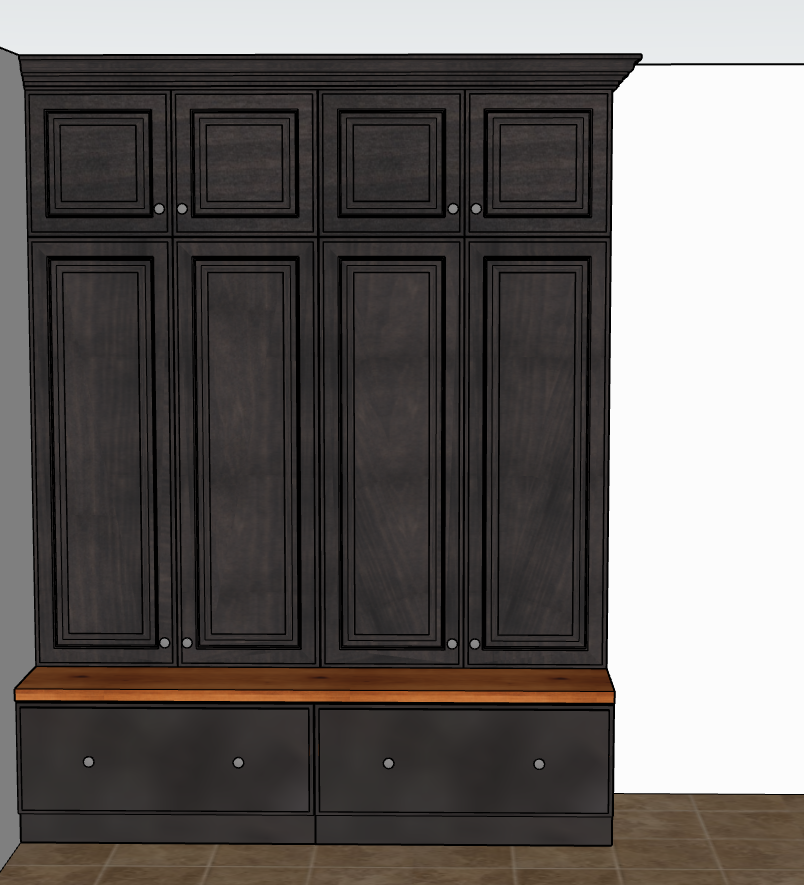 the cabinets are made of dark stained alder the wood top bench is a natural stained alder with a toffee glaze cabinets go all the way to the ceiling the cabinets on top of the bench have doors the floor is an off white tile