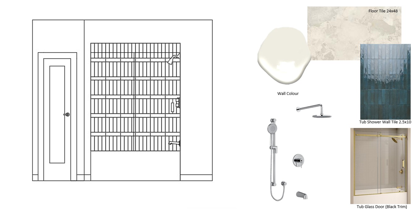 warm modern bathroom with tub shower alcove with blue wall tile in pattern shown in elevation and tub shower clear glass door with black trim similar in style to photo that sits on tub ledge in a room with creamy large 24 x48 matte floor tile with walls painted swiss coffee as shown in chip in photo and linen closet door to left of tub shower