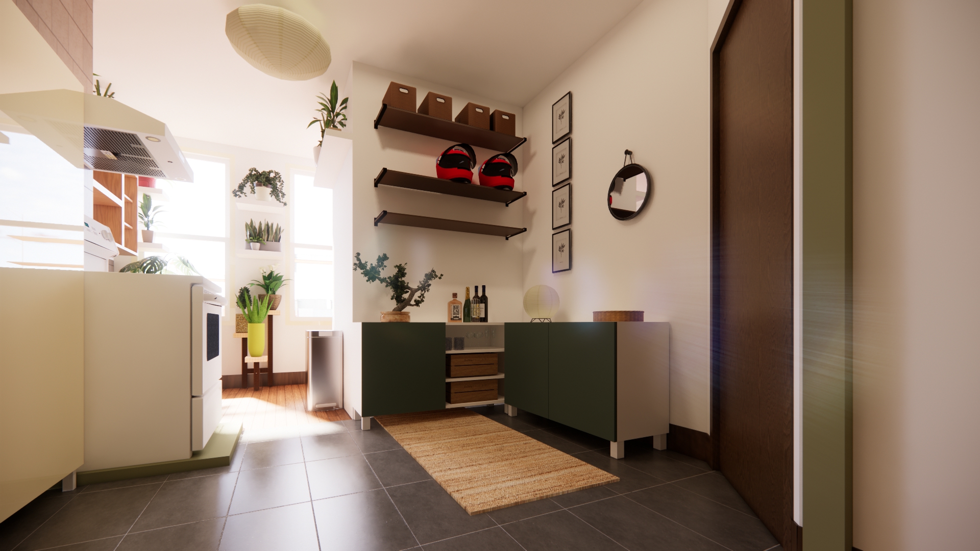 do not change any geometry on this image light up the lights with a warm soft light and replace the artwork in the picture frames with colorful art
