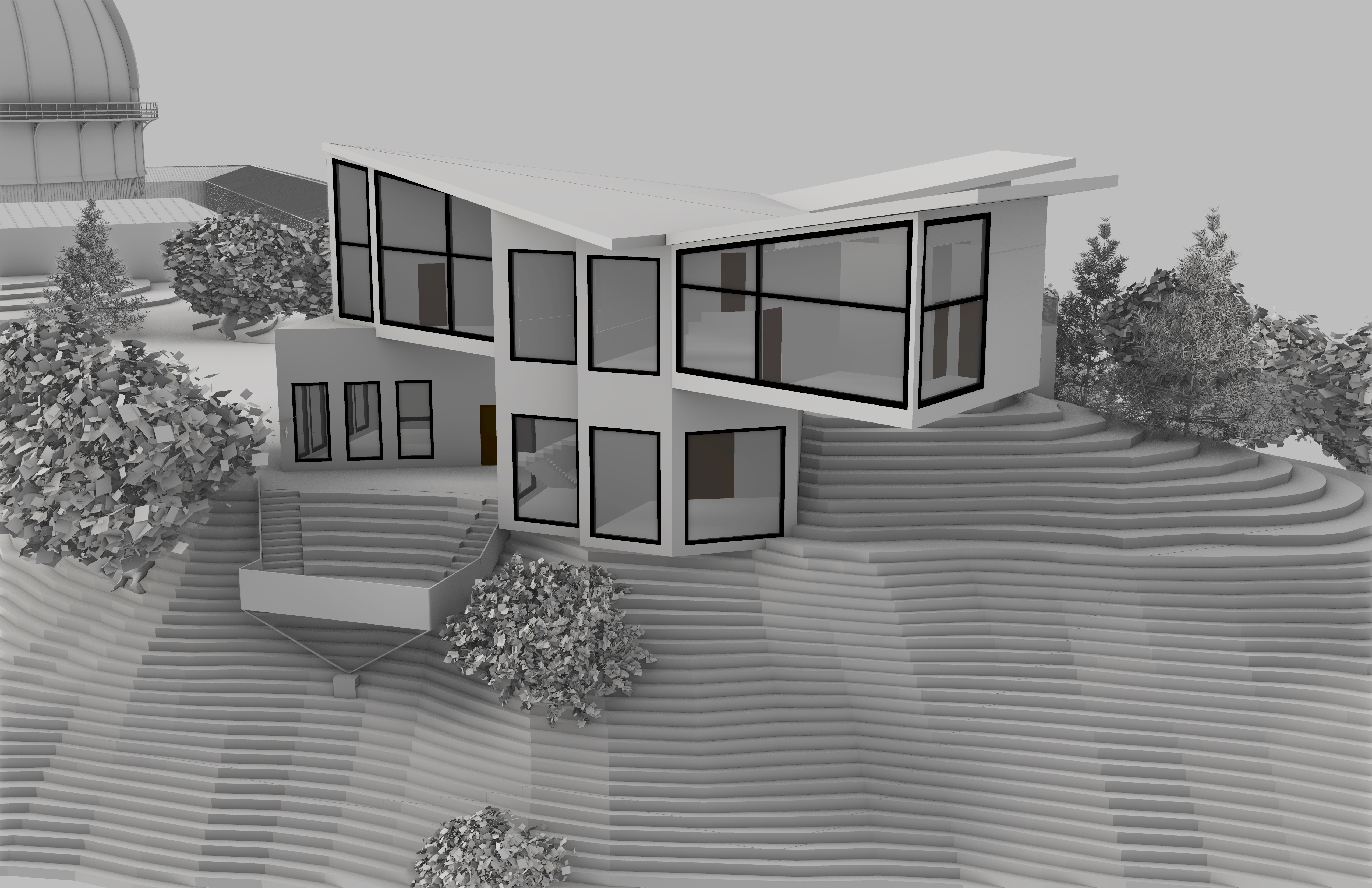 architectural rendering of a small contemporary research station perched on a rocky cliff structure made of warm wood black steel and glass precise and realistic architectural detailing cantilevered over stone terrain supported by steel beams surrounded by mountain pines and mist below rendered with crisp building geometry and realistic materials background and edges dissolve into loose watercolor washes and white paper edges not full bleed with soft unfinished fade around the image visible pencil and ink linework with light technical annotations artistic yet grounded balance of precision and painterly abstraction calm morning light concept architectural visualization style