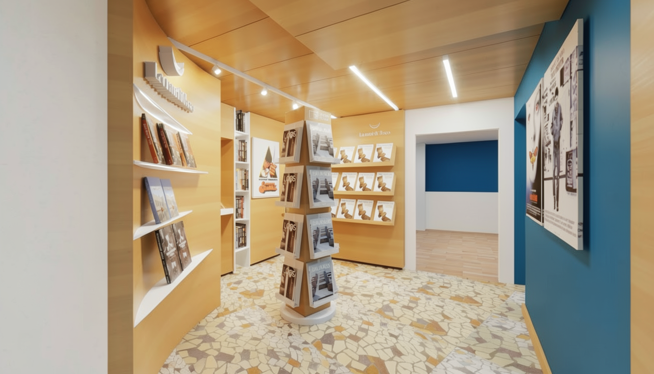 interno di un book shop con luci soffuse non troppo forti pavimento in palladiana non lucido pareti e controsoffitto rivestite con pannelli in legno chiaro non lucidi totem espositivo centrale in legno con mensole in plexiglass mobile libreria verticale in plexiglass