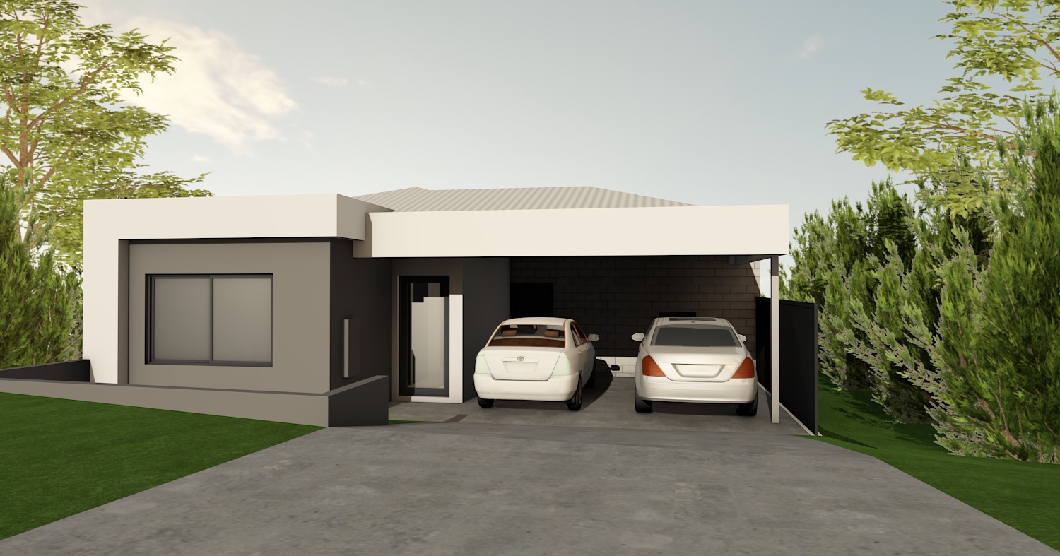 sunny afternoon in lush green trees heavy gardens along footpath to front door courtyard black garage door