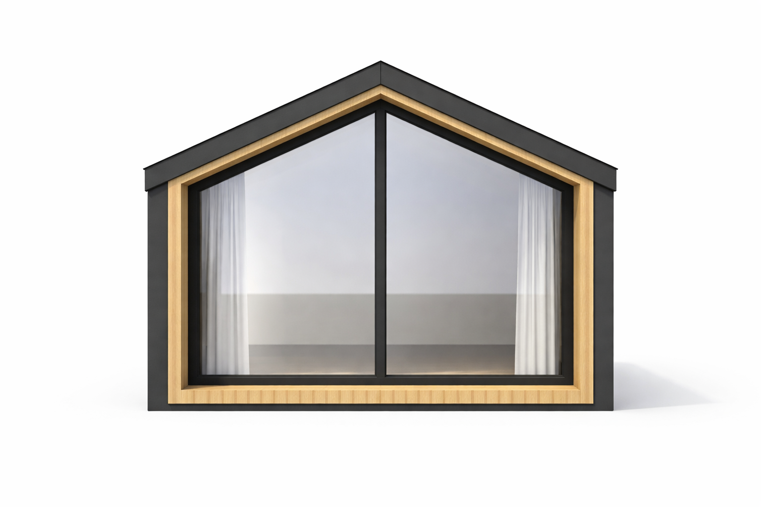 generate a realistic frontal elevation of a modern single family modular house based strictly on the provided orthographic front view preserve exact proportions width and roof pitch gable roof with clearly visible steep angle and dark trim do not modify the building geometry the front facade must feature a large floor to ceiling glazed window that reaches all the way down to the base no visible wooden panel below the glass create a bay window effect oriel extend the side walls forward by approximately 40 cm recess the main front glazing inward relative to the outer wall line clearly show depth and shadow revealing the recessed glazing materials vertical light wood cladding dark graphite black trims and window frames clean minimal detailing camera perfectly frontal view orthographic feel no perspective distortion eye level height 35 50 mm lens equivalent lighting neutral daylight soft shadows emphasizing the recess bay window depth scene plain neutral background no environment no people no vegetation style semi realistic architectural visualization clean sharp high detail strong visible wall offset and deep window reveal
