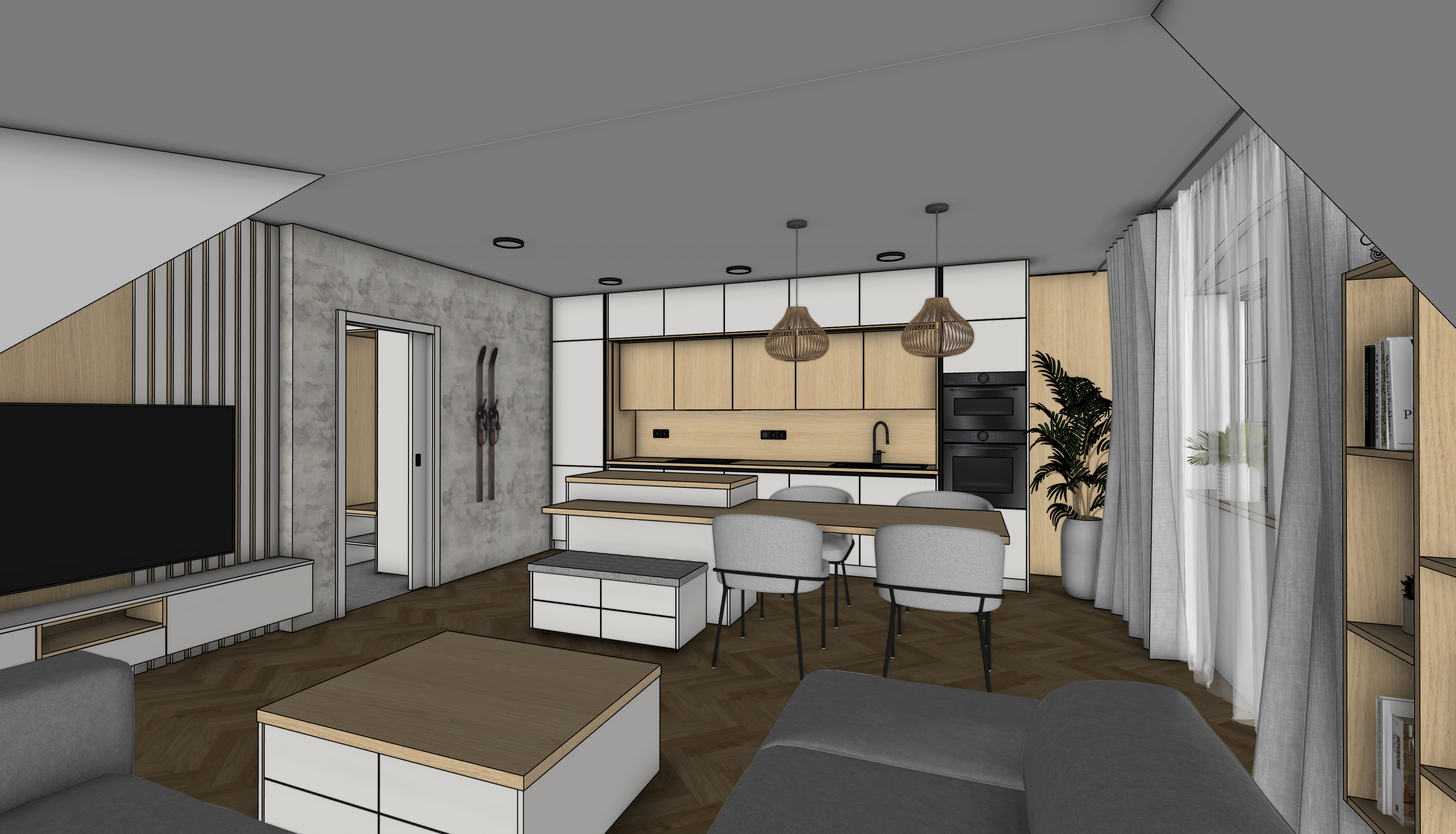 photorealistic render of the uploaded sketchup kitchen image preserve exact camera angle and all original textures materials no redesign add realistic warm led under cabinet lighting ceiling lights and sunny daylight from outside with global illumination and natural shadows ultra realistic architectural photo ray traced 8k