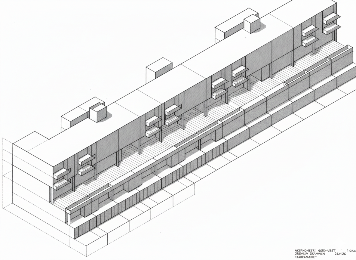 ultra photorealistic architectural visualization derived from a hand drawn sketch of a housing project the sketch is interpreted with accurate geometry realistic construction logic and true to life proportions architecture inspired by tadao ando minimalist volumes smooth exposed cast in place concrete with subtle imperfections formwork lines and natural weathering high performance glass with realistic reflections refraction and interior depth correct window mullions and thickness concrete and glass junctions detailed with realistic tolerances extensive realistic planting integrated into the architecture mature trees shrubs grasses moss and climbing plants with natural variation irregularity and seasonal color differences landscape feels grown not designed overcast daylight soft nordic light with physically correct global illumination diffuse shadows accurate white balance no dramatic contrast cinematic photographic composition eye level camera 35 50mm lens equivalent natural perspective no distortion realistic scale with subtle human presence for reference people slightly out of focus natural poses true photographic realism 8k resolution ultra detailed textures physically based materials pbr natural color grading slight atmospheric depth no stylization no illustration no cgi look