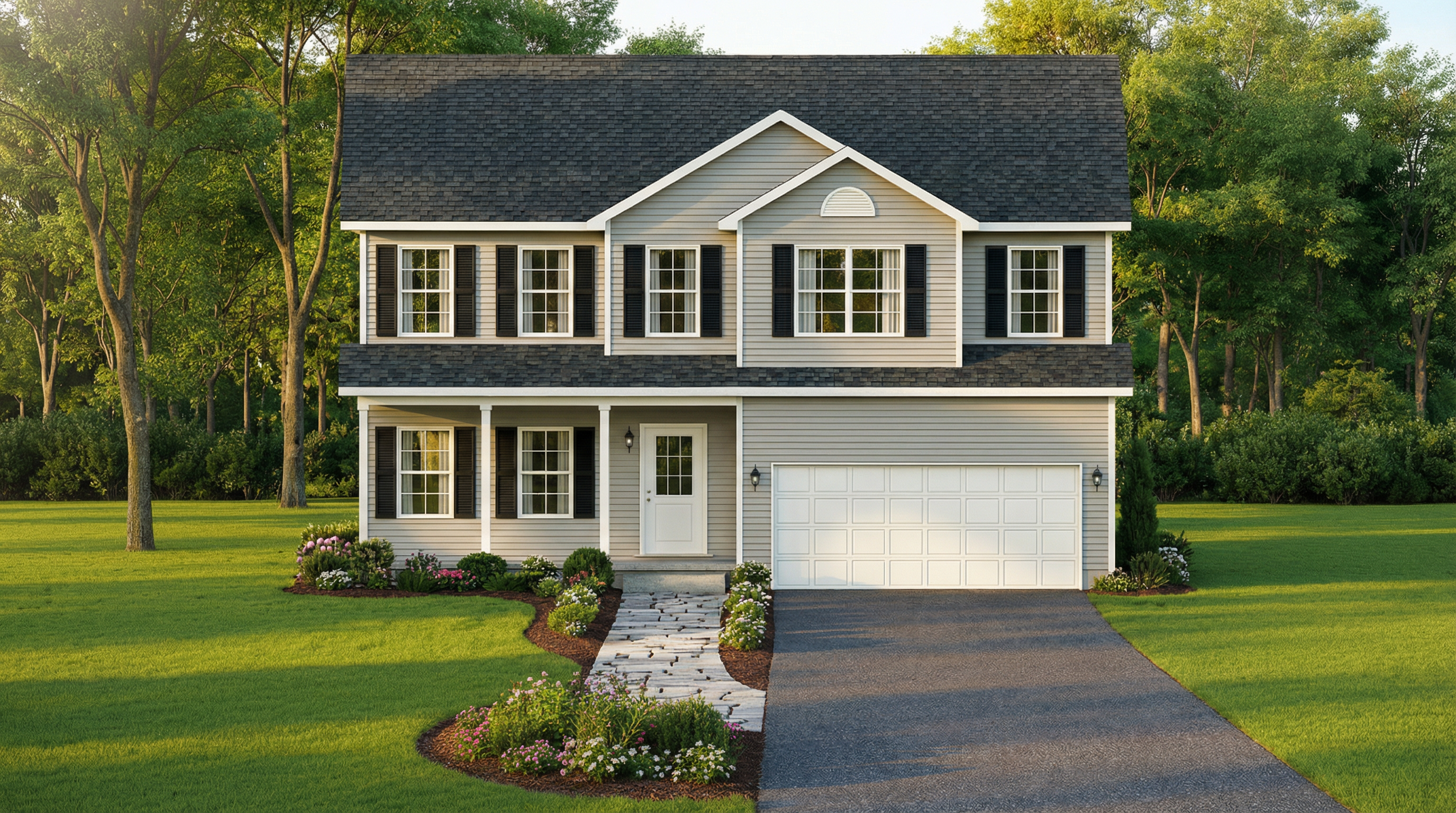 a manicured lawn native plants concrete pathway around the building pawed parking lot in front pawed passing road and loading area on the right