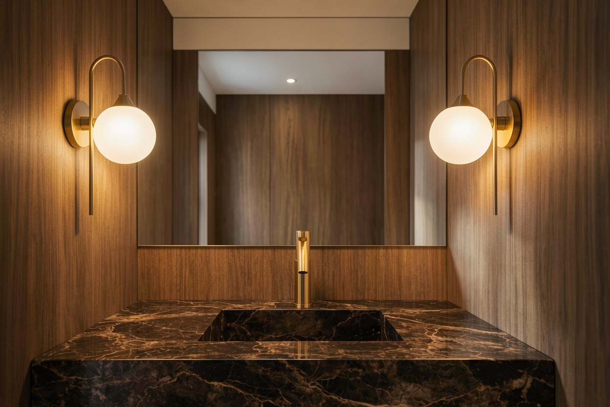 make the floors a little more grey with charcoal grout add a 2x2 sky light in ceiling near vanity and add recessed lights in back area