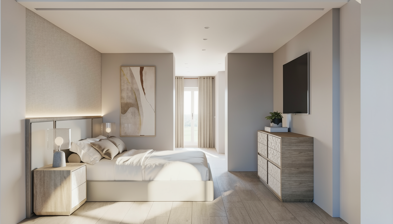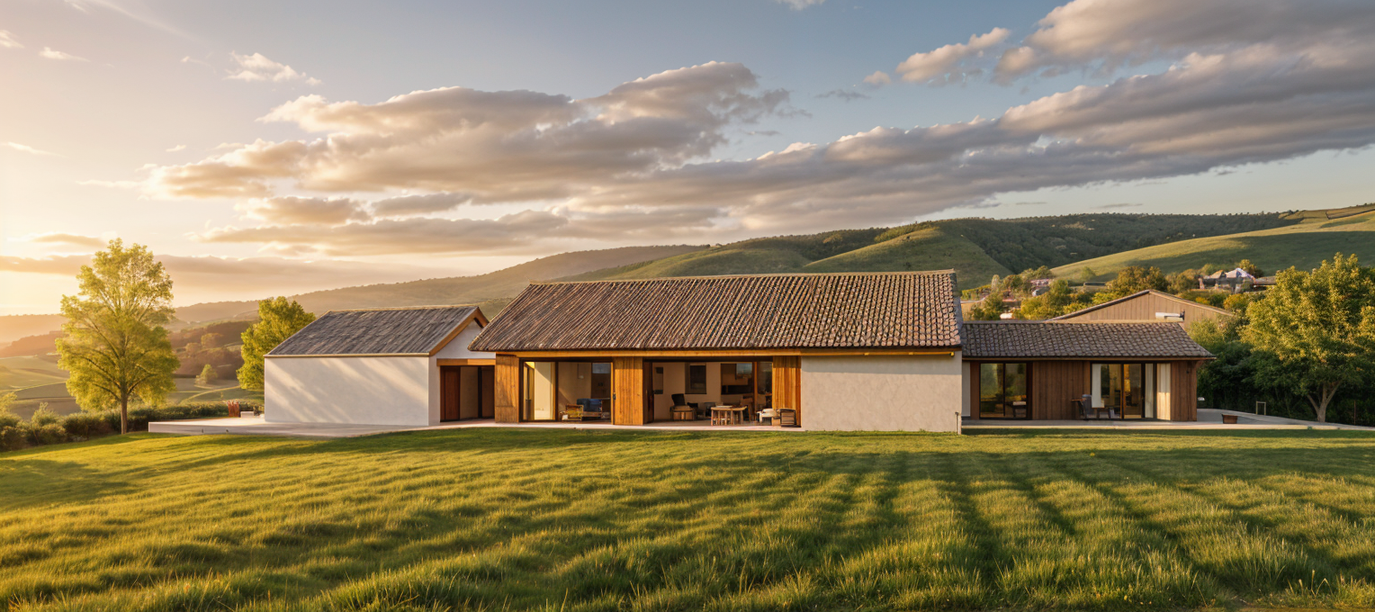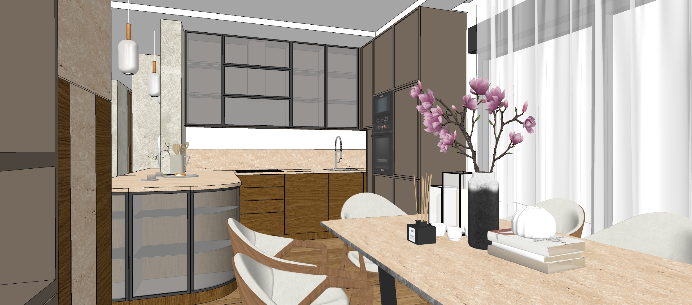 same interior design same materials and colors same furniture and lighting only a different camera angle floor parquet oak seamless in honey color kitchen modern with travertine stone working top and same stone on the wall between kitchen elements but to half of the height kitchen breakfast area is rounded visible on the left side the top surface is travertine stone material above that is visible one pendant lamp under the rounded part is glass rounded doors put some plates and glasses and decoration inside that element behind the glass doors upper kitchen cabinets with glass with metal frame in anthracite color put led light in horizontal lines under the shelves inside the upper kitchen cabinets small part od the wall behind breakfast area painted with some decorative wall paint technique in white and just little grayish color right part of the kitchen is in brown color height kitchen elements in the central area of the picture there is visible a part of the dining table and chairs preserve the architecture and layout
