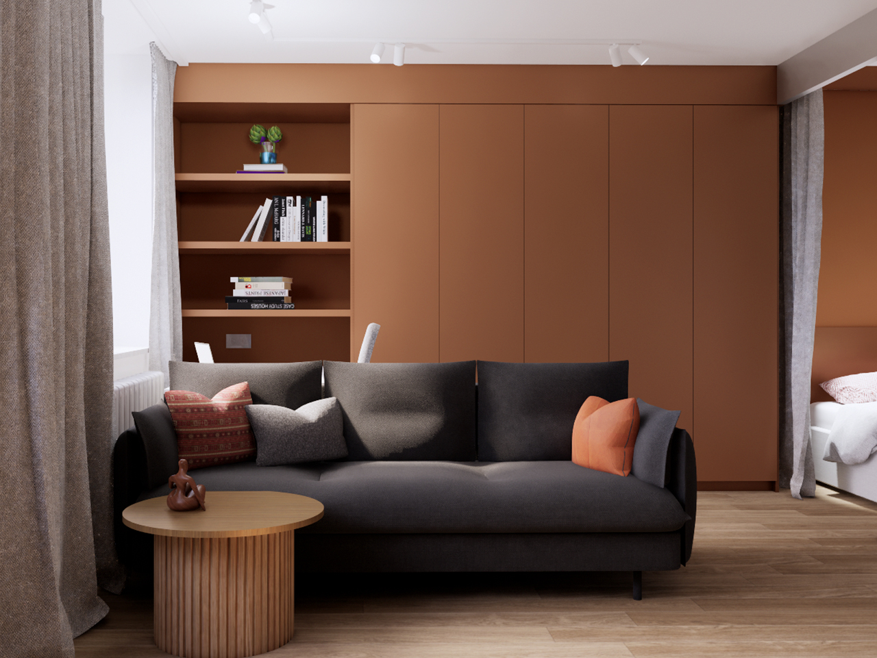 international style interior shot modern minimalist living room with a built in wall unit and shelving a dark fabric sofa and a small round wooden coffee table keep the exact same layout composition furniture placement and overall design change the dominant wall and cabinetry color to a muted burnt green earthy desaturated green tone maintain a minimal aesthetic with very few decorations and clutter keep soft natural lighting neutral curtains and wooden flooring preserve the original materials proportions and camera angle any mirror reflections must be fully consistent with the room accurately reflecting the same colors lighting and elements for a coherent and realistic look subtle realistic textures high end interior design style clean and calm atmosphere architecture