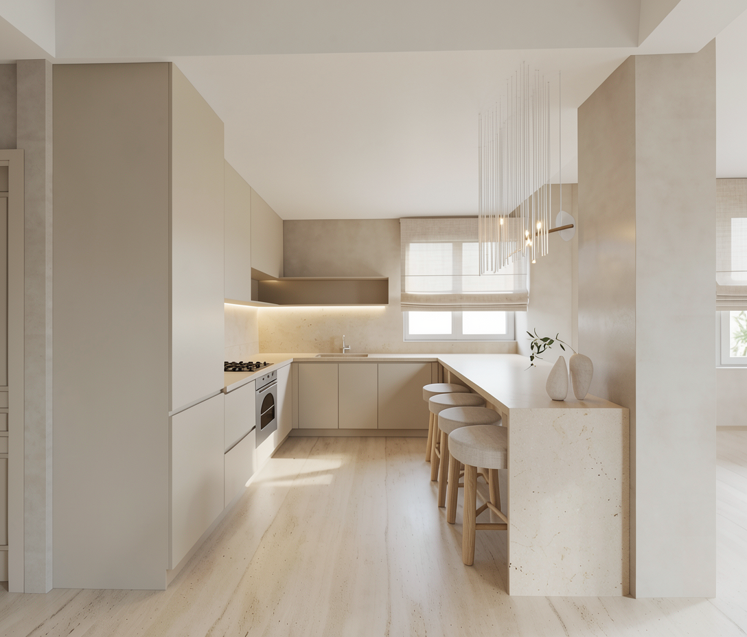 create a highly realistic render of a modern kitchen in a coastal home with a calm warm and refined atmosphere the design is minimal and cohesive inspired by seaside living with a soft neutral palette that evokes natural light sand tones and a relaxed elegance the kitchen layout is linear with an l shaped extension featuring clean handle less cabinetry in a light beige tone with a matte finish the surfaces appear smooth and seamless the countertop and backsplash are in a natural light beige stone reminiscent of sand and coastal textures with subtle variations and a soft matte finish a hidden led strip is installed beneath the upper cabinets providing soft indirect lighting that gently illuminates the backsplash and enhances the warm ambient atmosphere in the foreground there is an extended kitchen island or bar with a monolithic appearance in the same light beige stone material in front of the island there are bar stools with light oak wooden legs and a natural finish the seats are upholstered in a soft light beige linen fabric adding a breathable coastal character at the back a window allows soft natural light to enter the space filtered through a light fabric roman shade in a neutral tone reinforcing the relaxed seaside feeling the walls are finished in light beige microcement and the flooring is in a light natural tone enhancing the airy and serene coastal atmosphere the overall lighting is soft and diffused combining natural light with hidden led lighting creating minimal shadows and a warm inviting high end coastal ambiance ultra realistic render high resolution premium materials coastal interior design interior design magazine photography style style elegant and minimal the shelves on the kitchen n above the kitchen island there is a suspended light of thin white ropes add to the shelves of the kitchen some decor minimal and elegant the oven is white