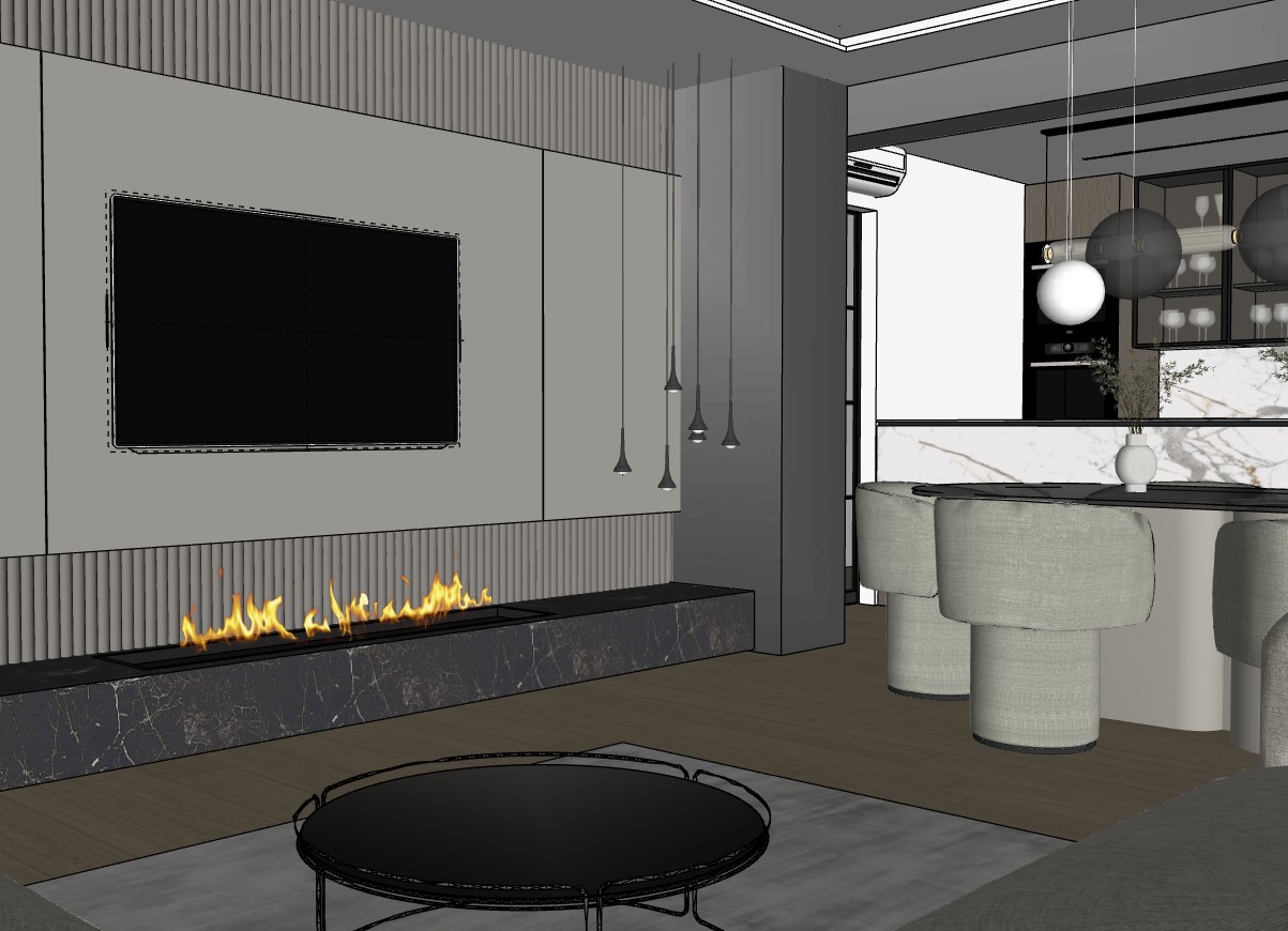 render with extreme realism the protruding wall next to small pendant lamps is grey mirror