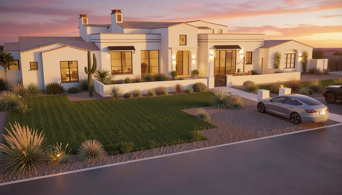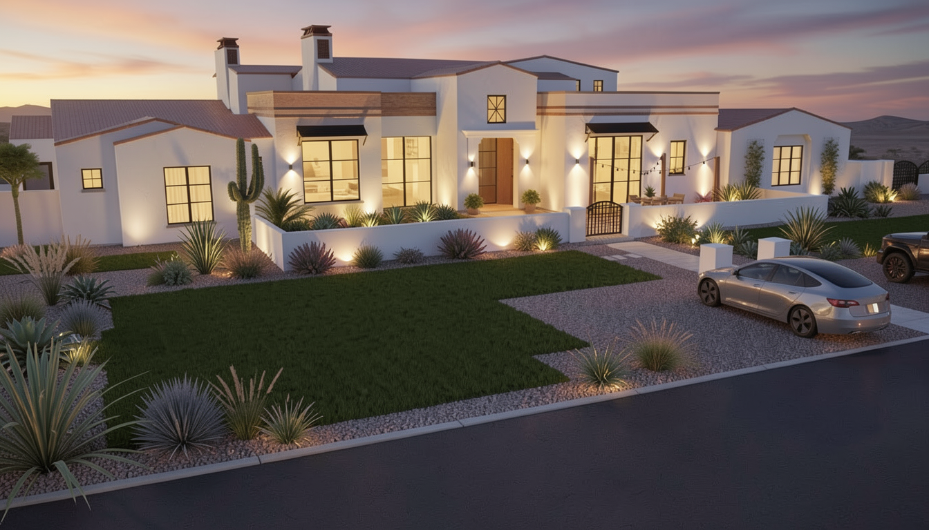 this house is in phoenix arizona i want a photo realistic rendering at dusk with accent lighting add vegetation in gravel areas around green lawn dont put any plants in the grassy areas