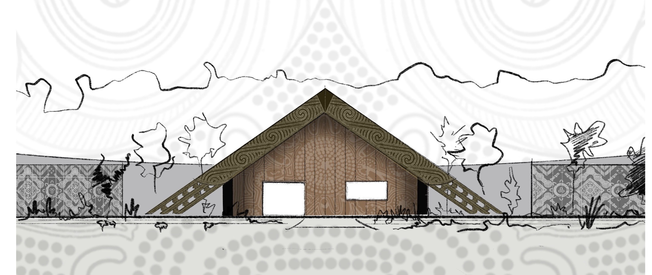 convert photo to a realistic render of the buildings preserve all existing facade and roof patterns exactly no furniture inside people outside emphasize doors and windows with their brown patterns show two simplified adjacent buildings on each side to indicate context brown patterns each side ensure patterns are maintained background of trees and light foliage maintain correct perspective shadows and high resolution 300 dpi